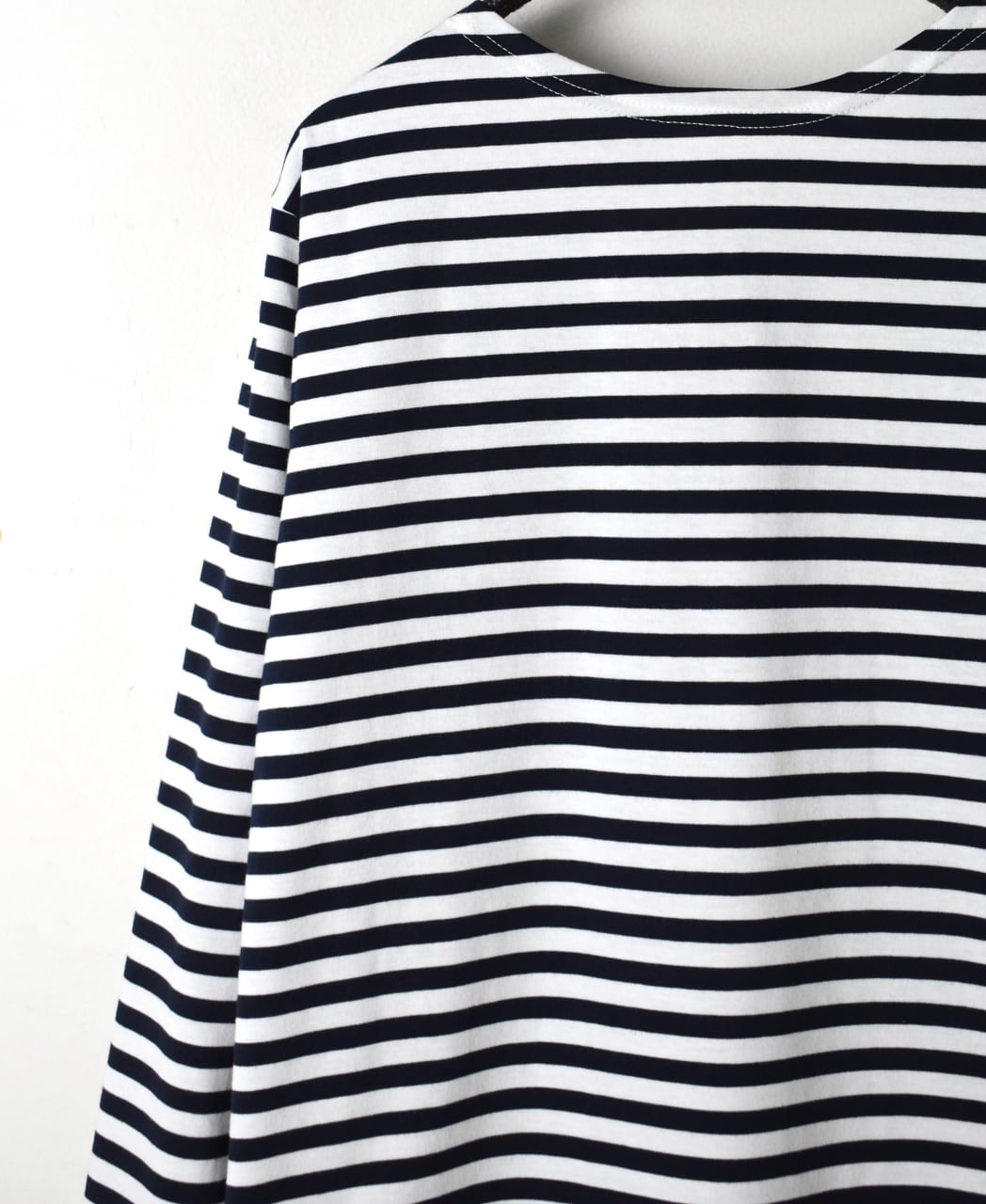 一般的なボーダーに比べ、少し細めなピッチのボーダーは、シンプルで繊細な印象を与えてくれるので、綺麗めなスタイリングにも合わせやすい一枚となっています。