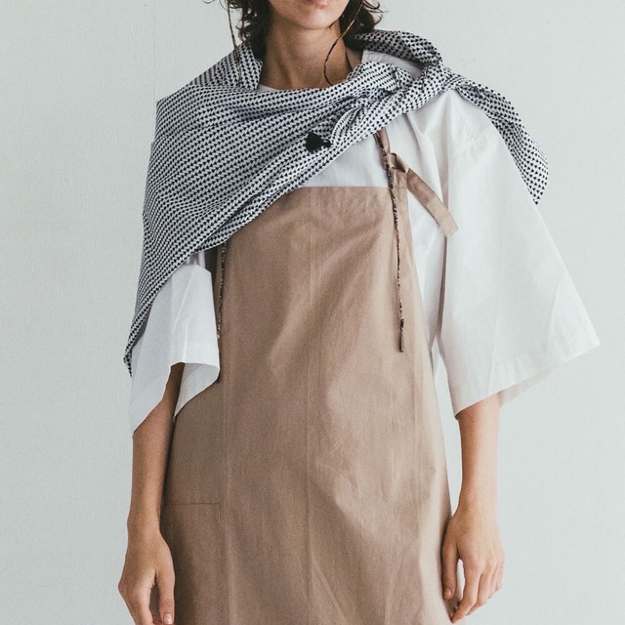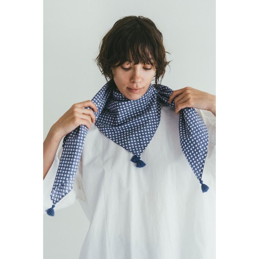 薄地のボイルコットンにシルクスクリーンでプリントを施した生地を大判のスカーフに仕立てています。