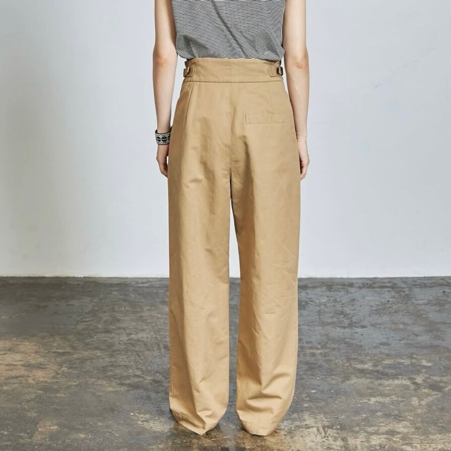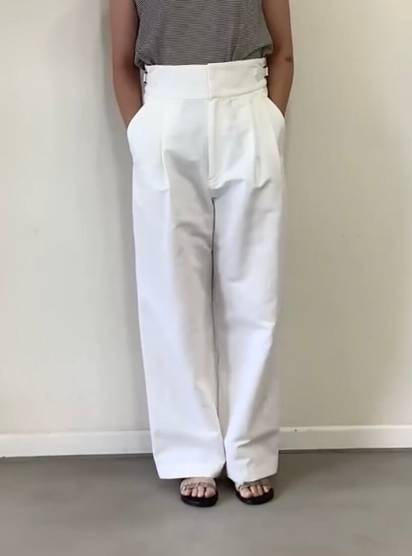通常のウエスト寸法より3~4cm大きめの設定のハイウエストで、サイドのアジャスターで調整していただくデザインです。