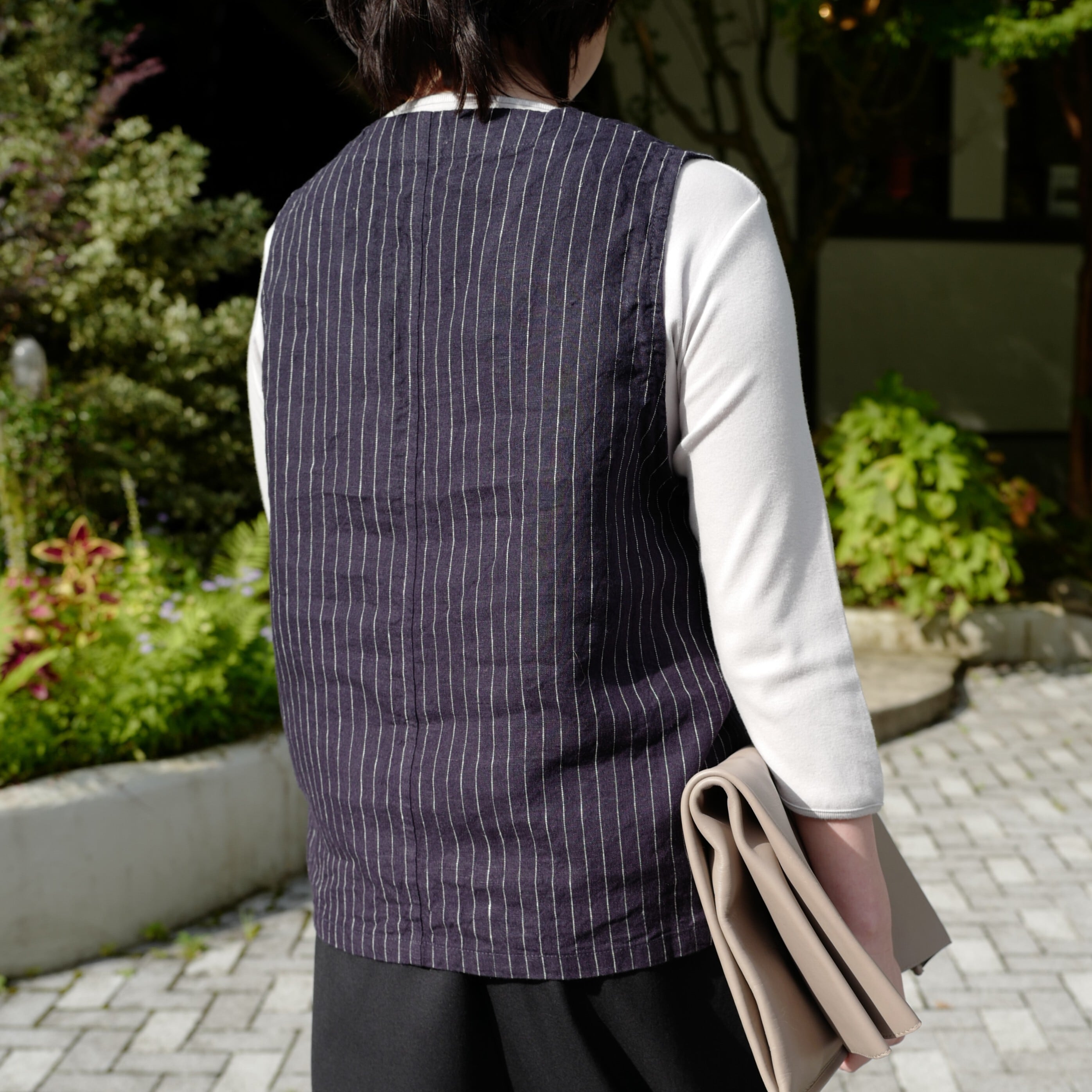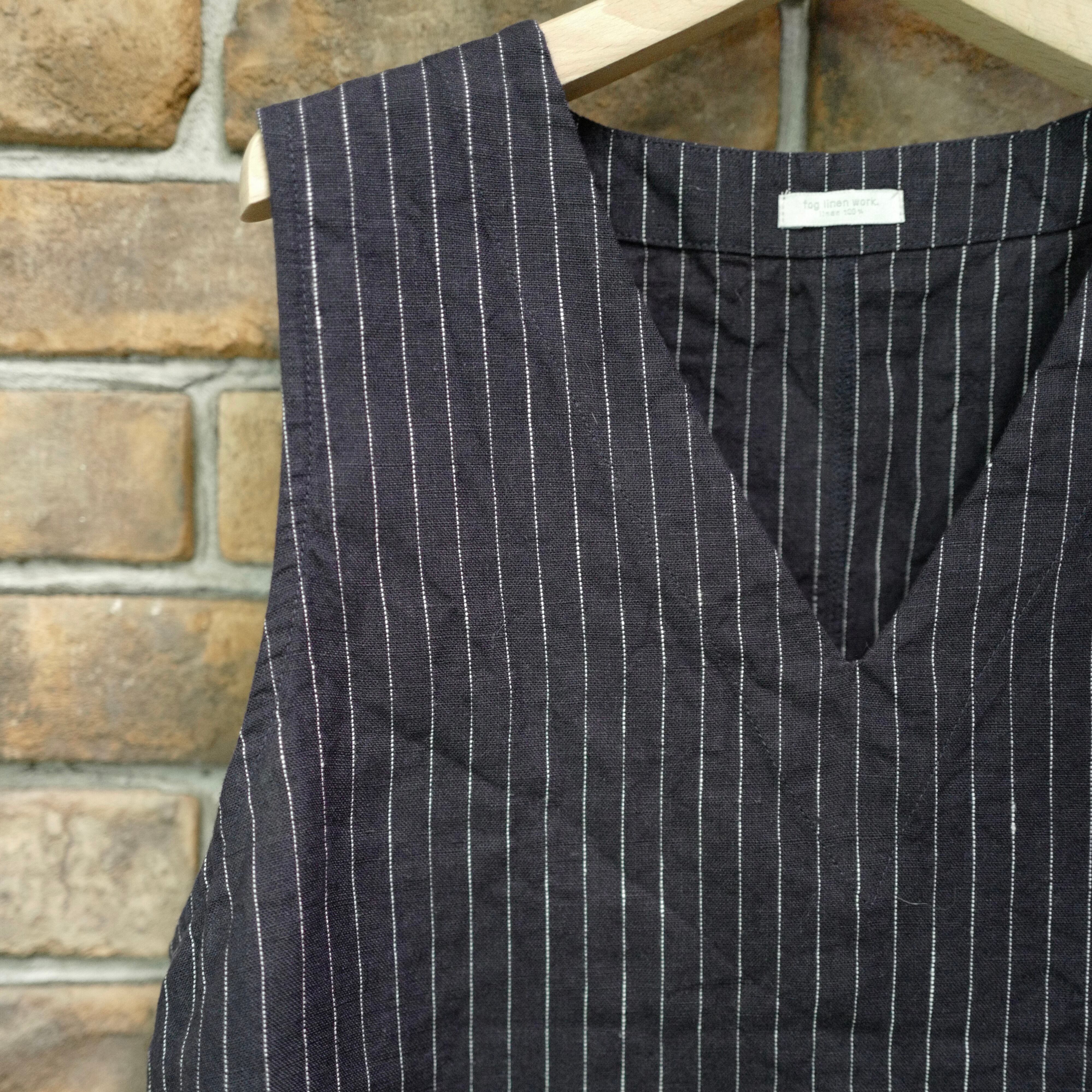 《別注》fog linen work|普通地リネンVネックベスト・ジレ(col.ハーパー/ネイビーストライプ)