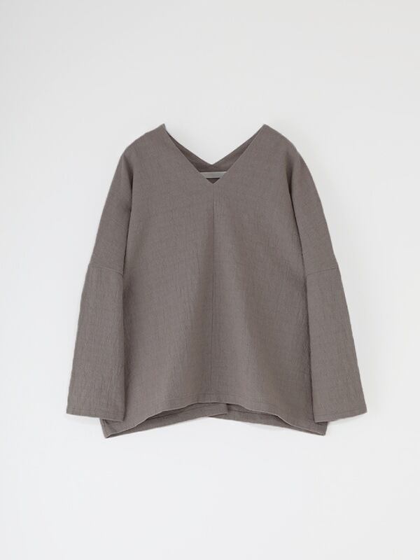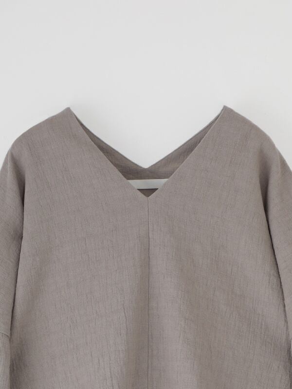 Vネックラインが首元をすっきりと見せ、凛とした印象を与えます。