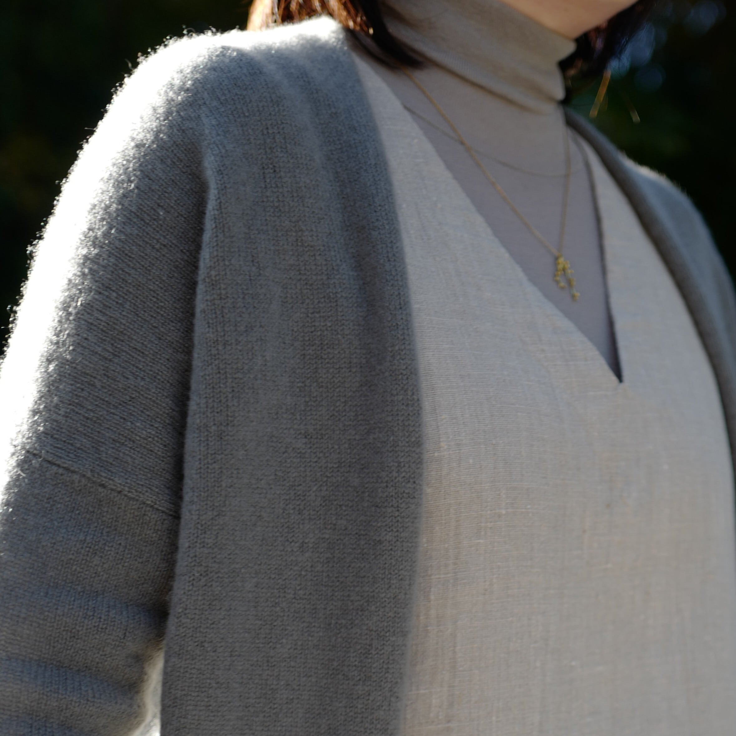 定番のカシミヤシリーズと同じ糸を使用して、ふわりと軽やかに編みたてたカーディガン。