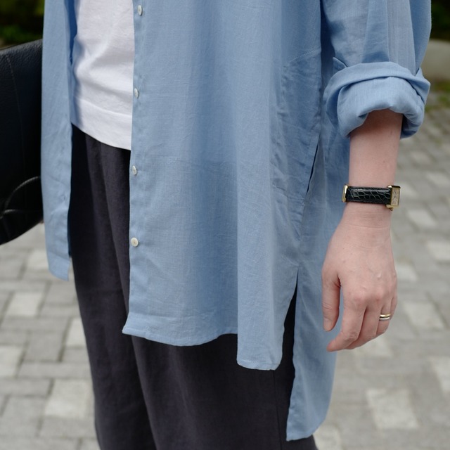 前後差がありサイドにスリットが入っているので、パンツスタイルはもちろん、スカートや長めのスリップドレスとのレイヤードスタイルもおすすめ。ドロップしたショルダーでオーバーサイズですが、柔らかな風合いで軽やかな着用感です。袖は長めなので捲ってバランスをとっても。