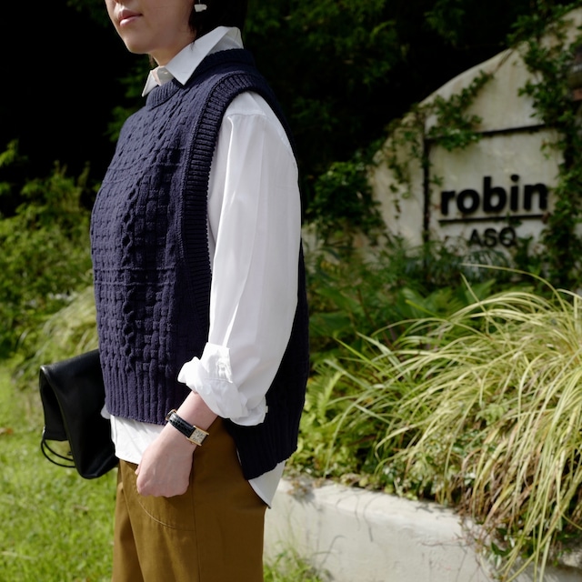 大きなアームホールで、どんなインナーとも合わせやすいニットベストです。