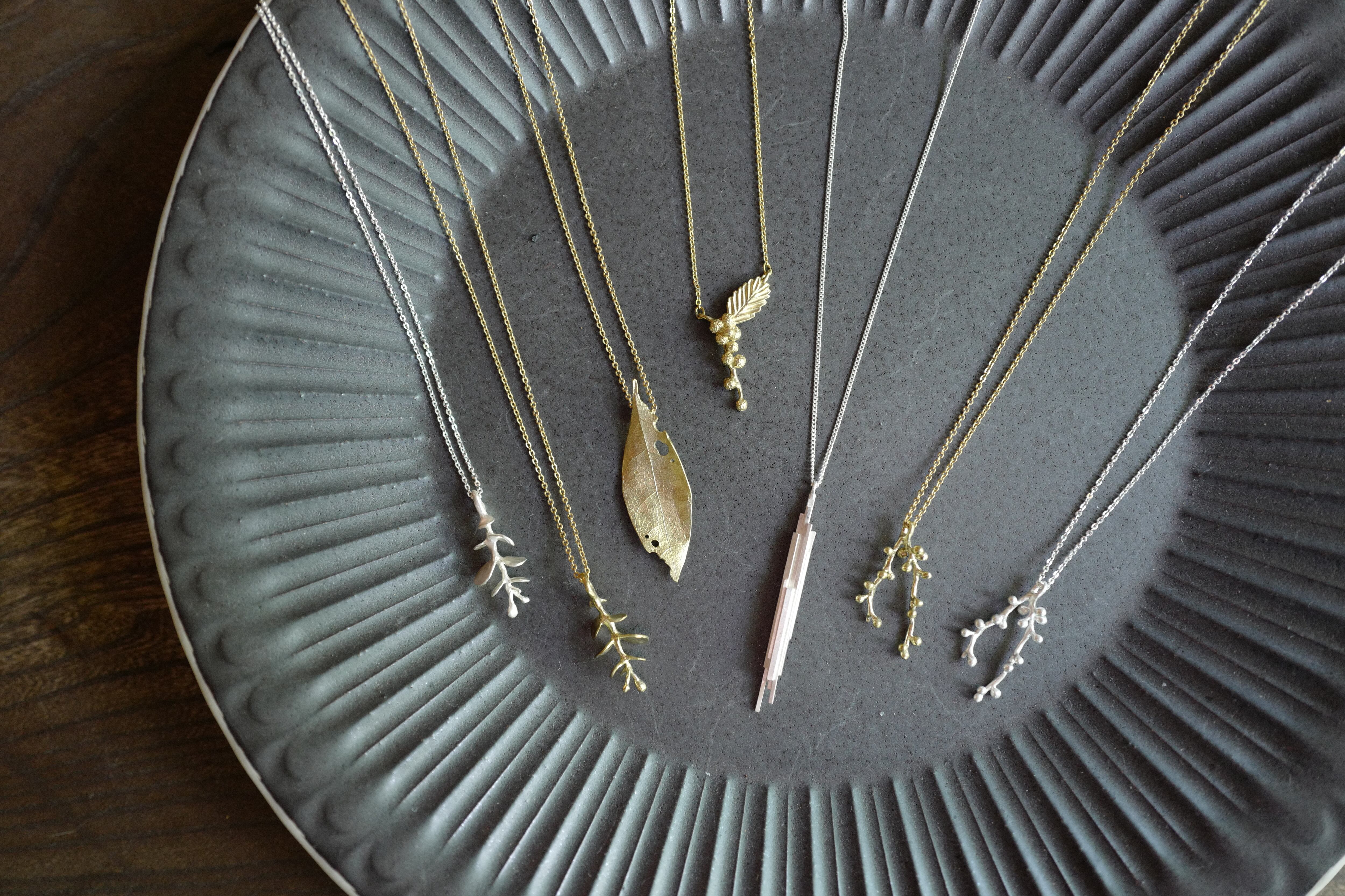 中村なづきさんのアクセサリーは、植物それぞれの季節にお使いいただくのはもちろんですが、好きな植物(モチーフ)はオールシーズンぜひ使っていただきたいです。