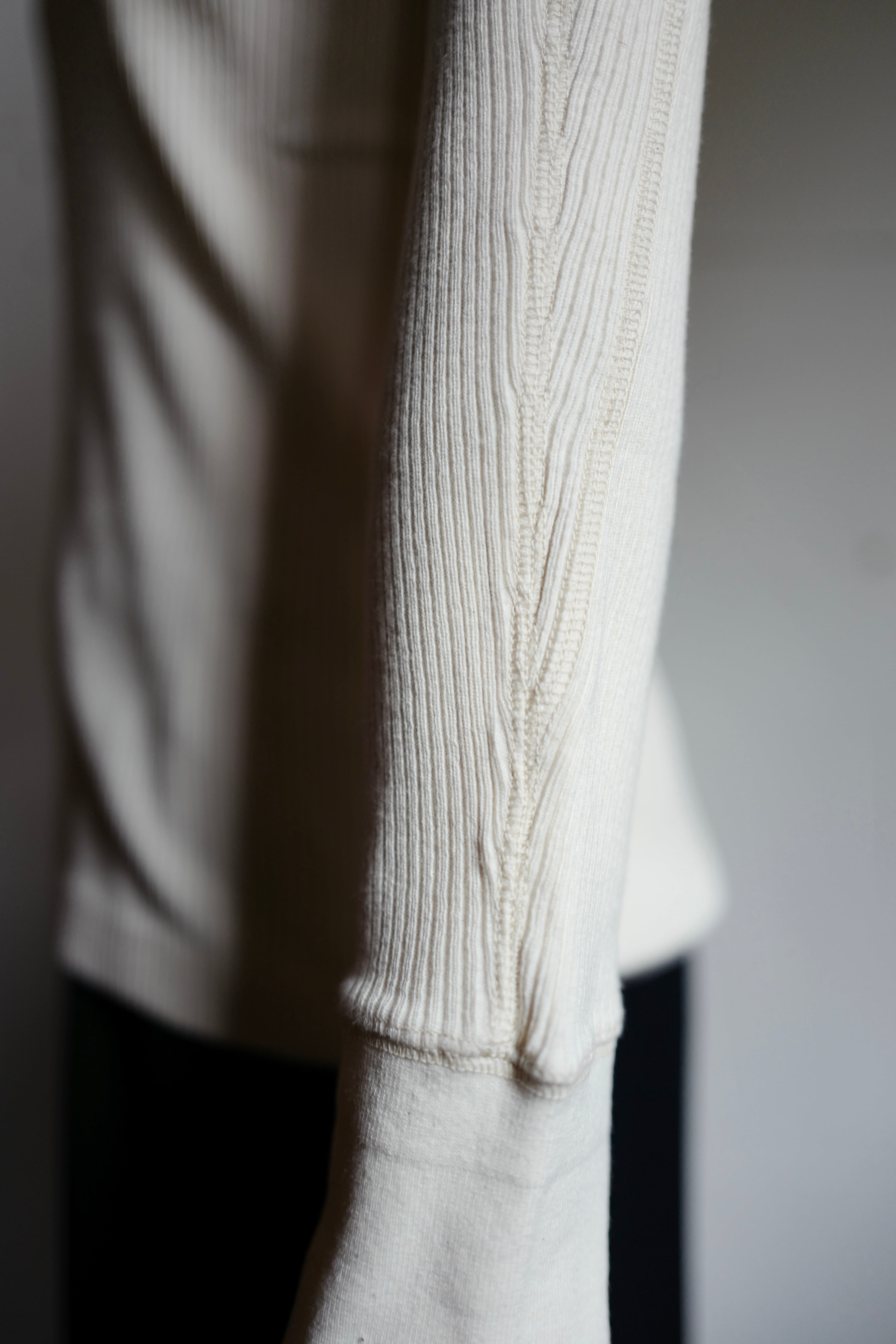 丸胴仕立てならではのシームレスな脇や袖下は、すっきりとした着心地を叶えます。袖口はさりげなく絞られており、だらしなく見えないのも嬉しいポイントです。