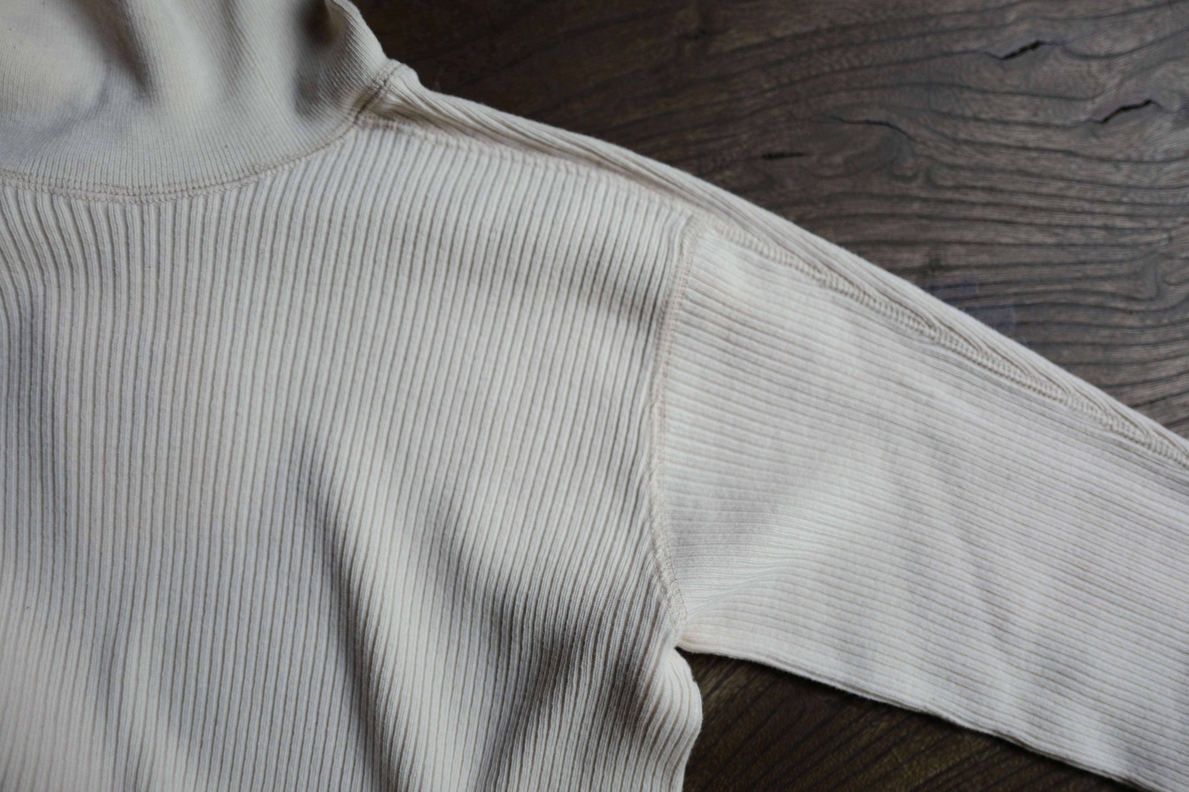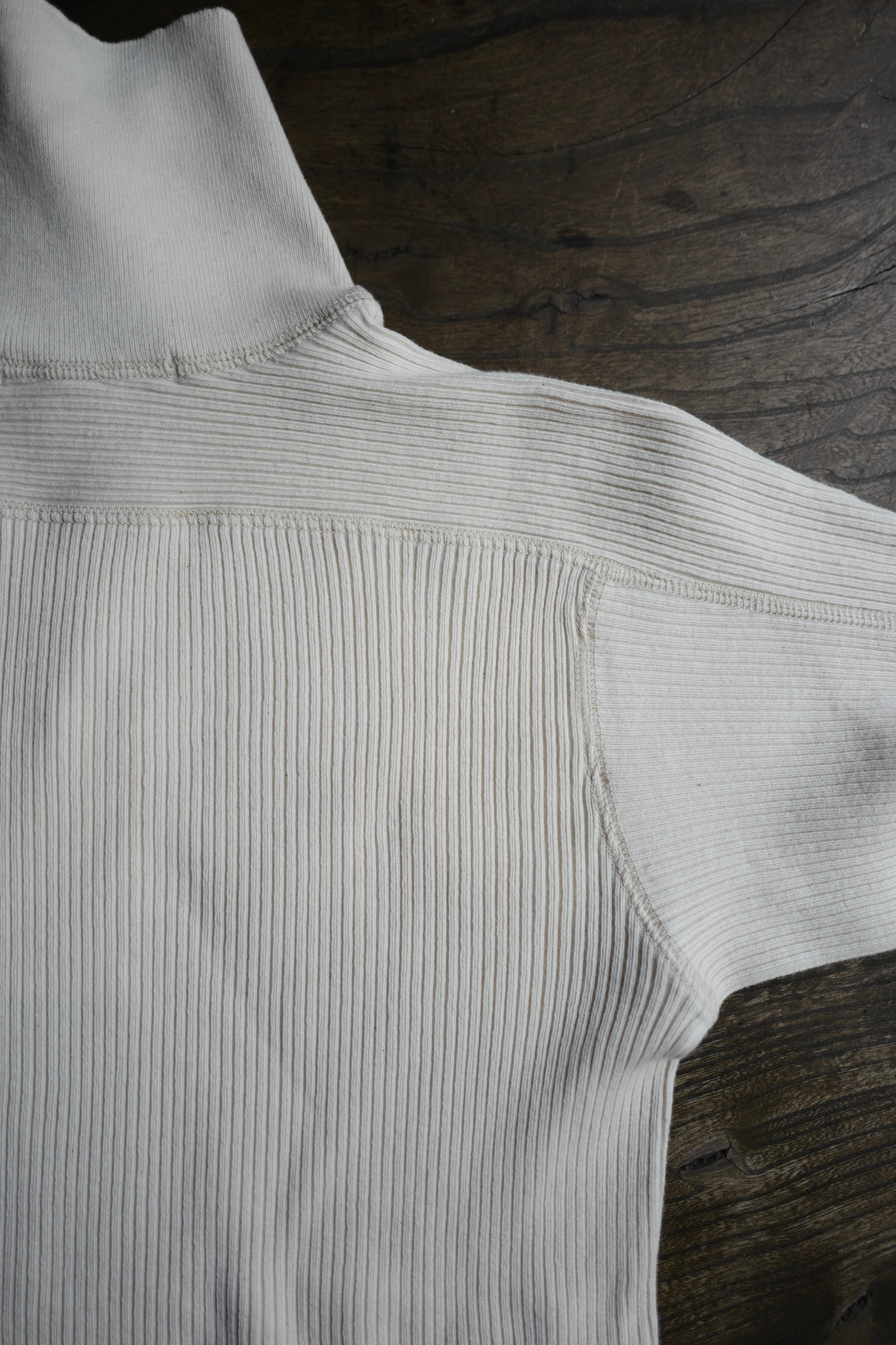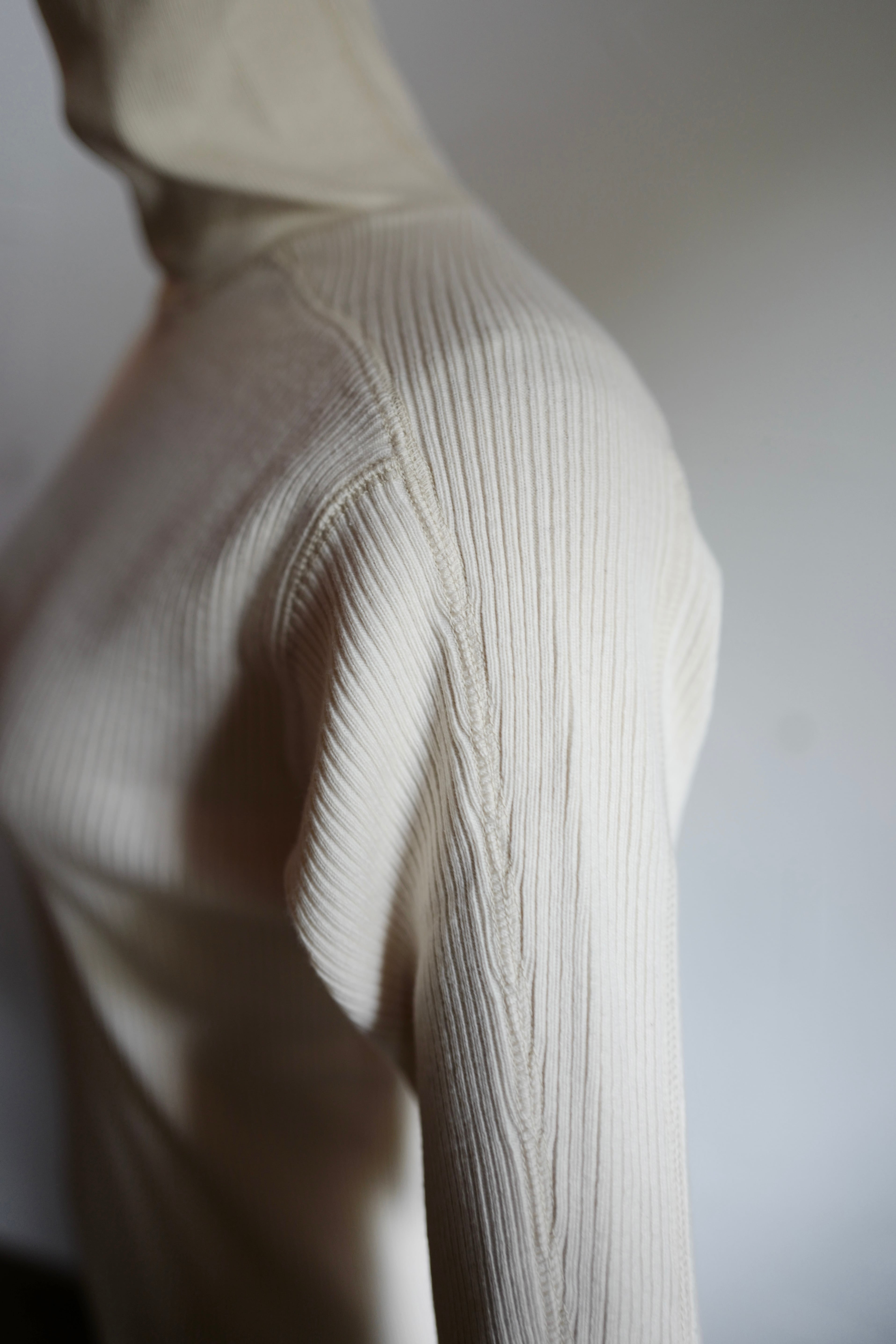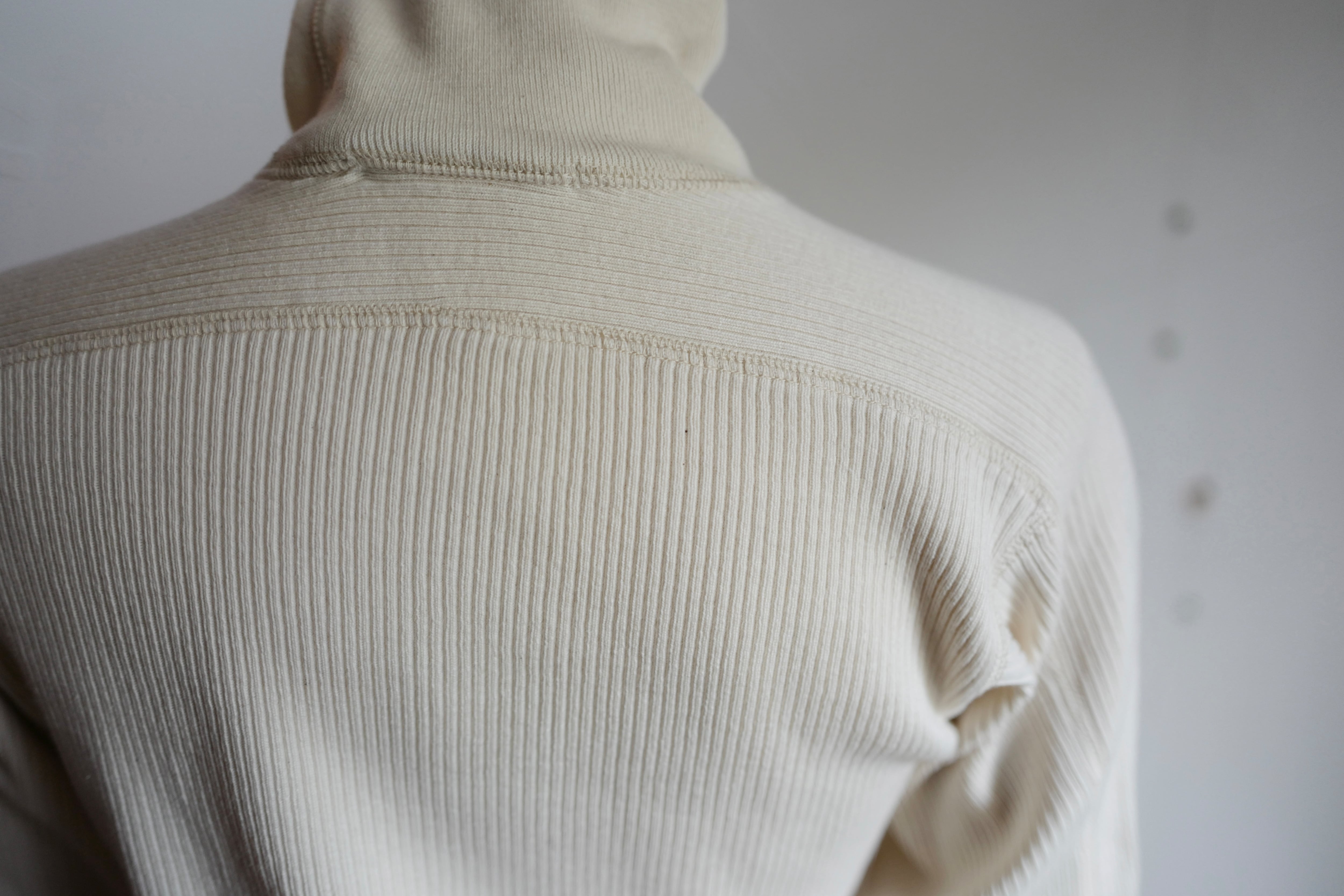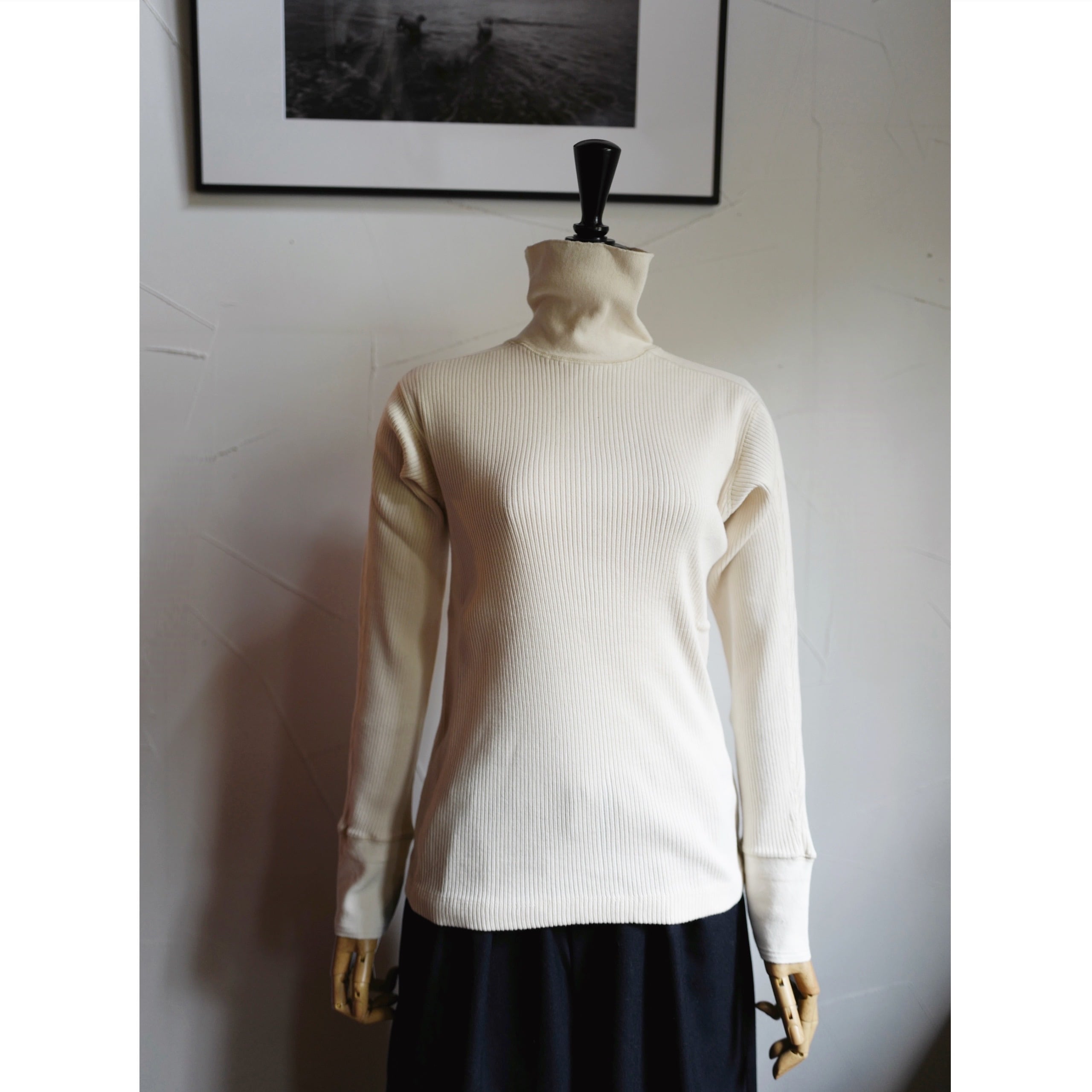 オリジナルで編み立てたコットン丸胴リブを使用した、長袖タートルカットソー。