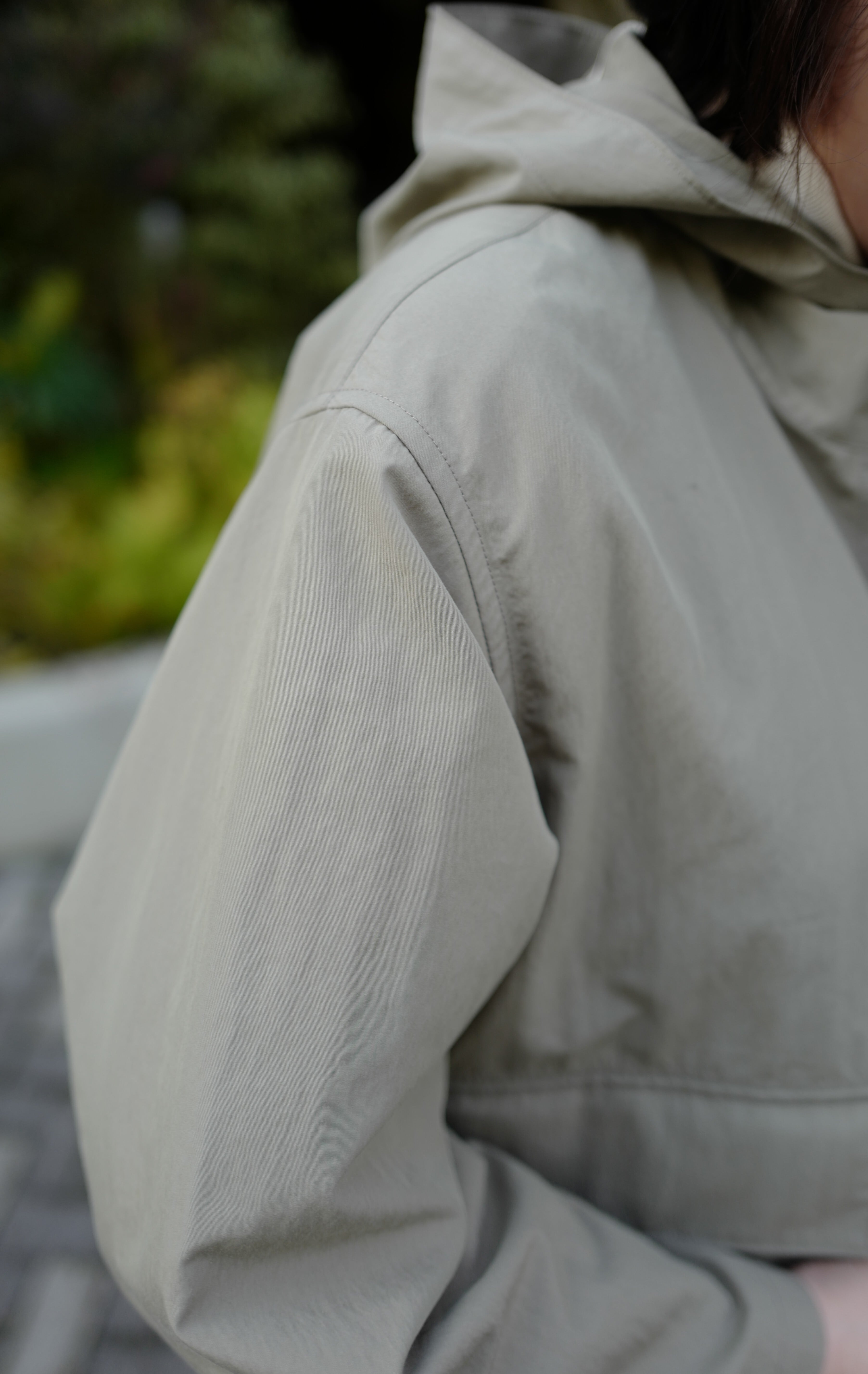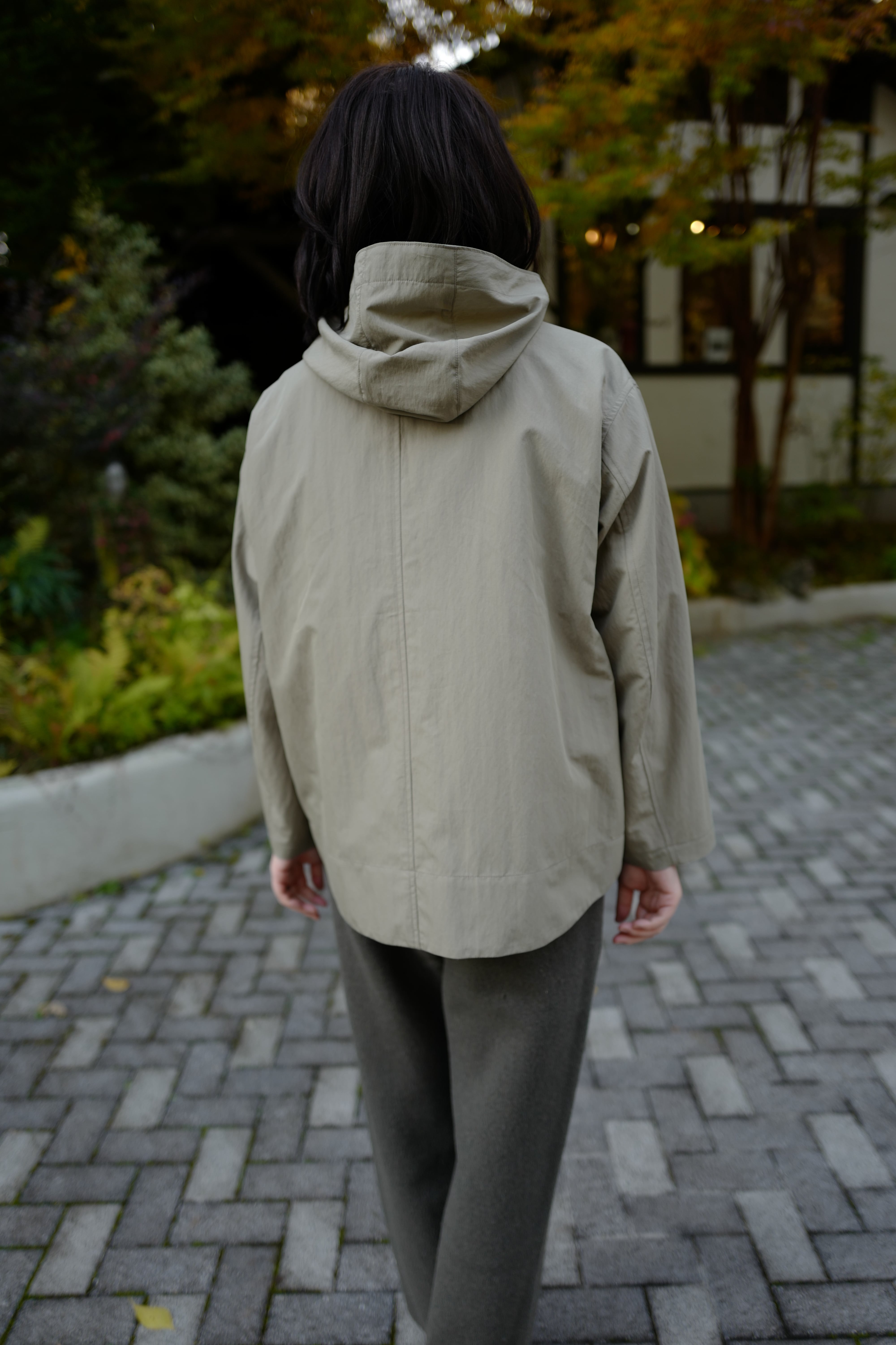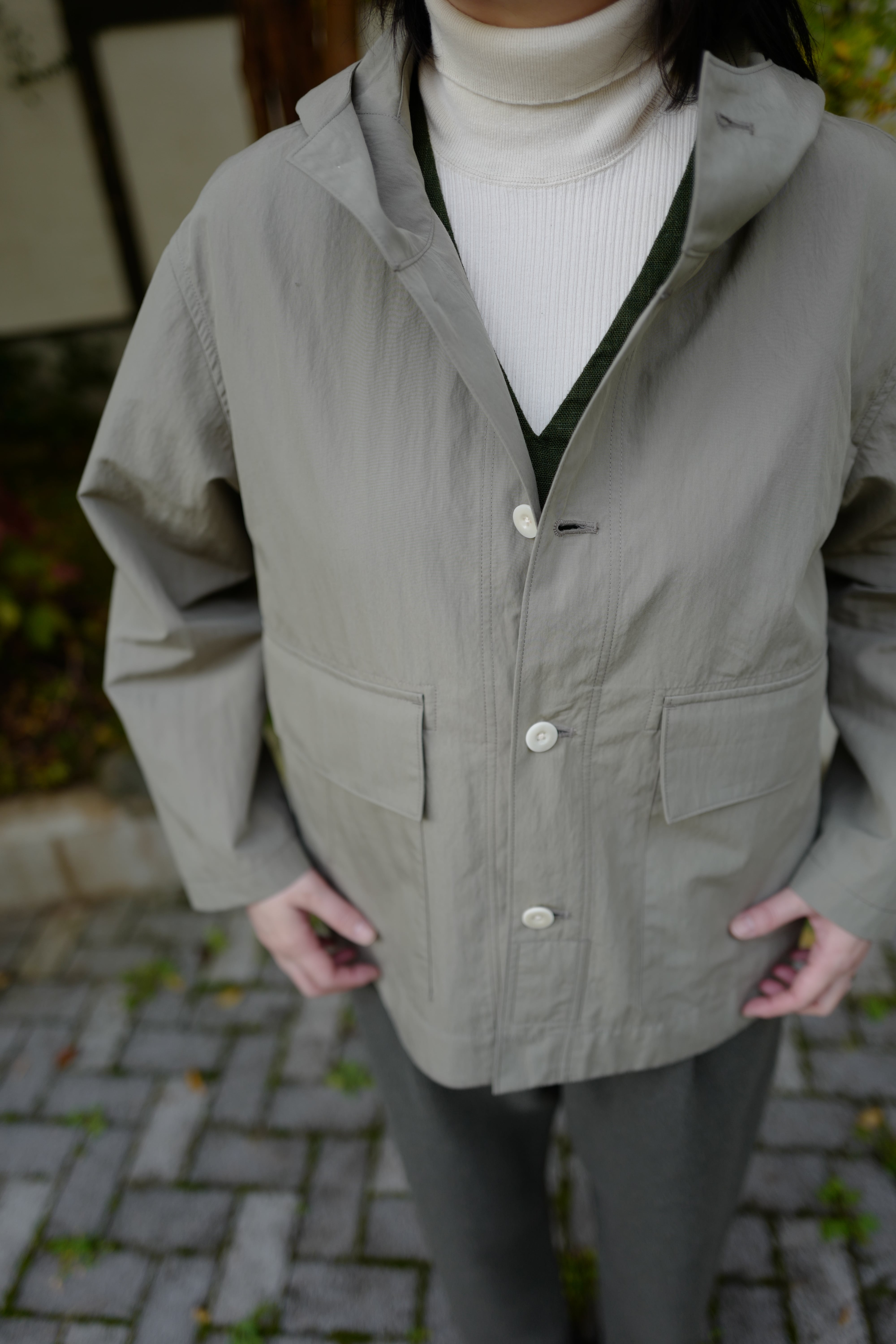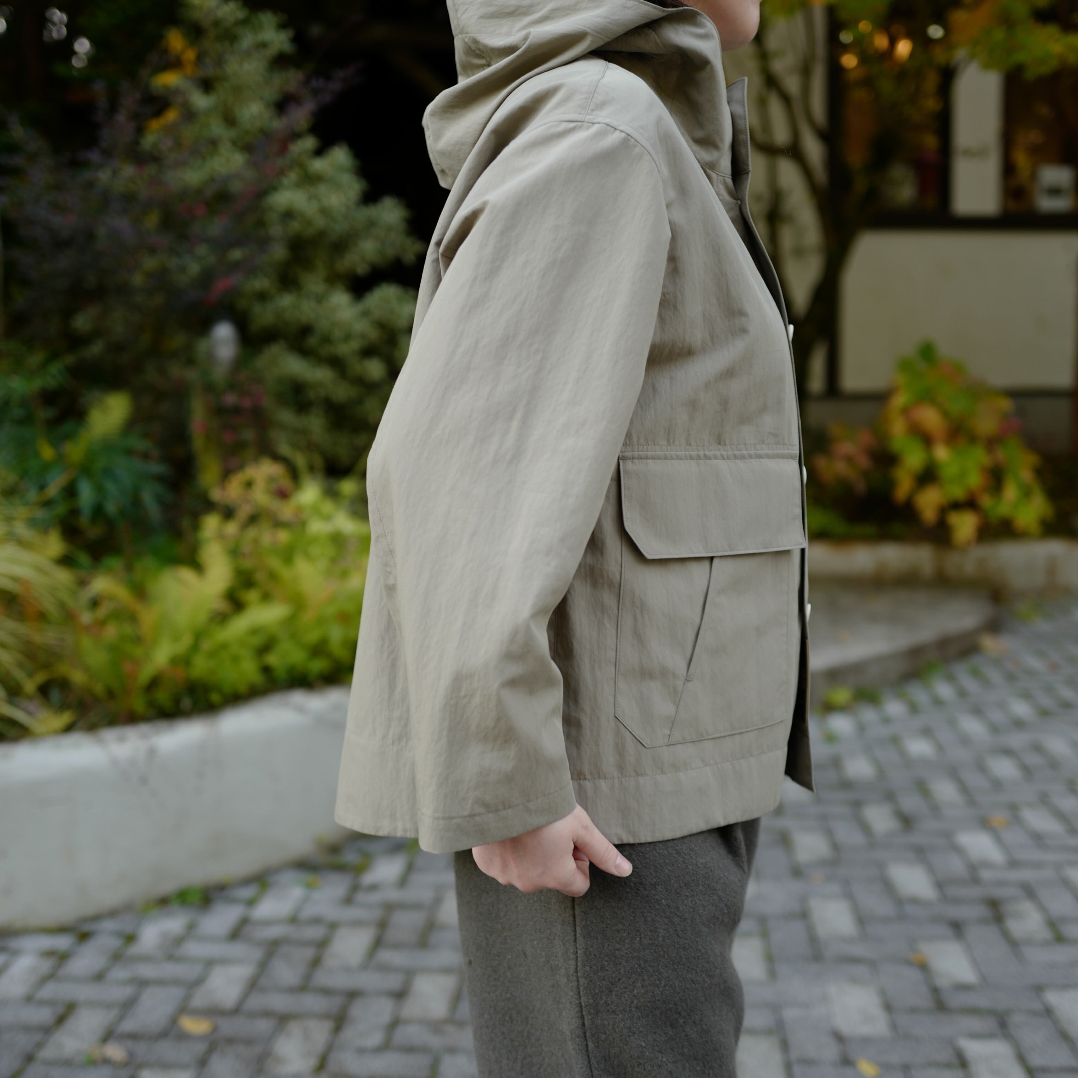 雨の日に駐車場から建物に入る際に、フードをさっと被るというシチュエーションを想定して作られた一品です。