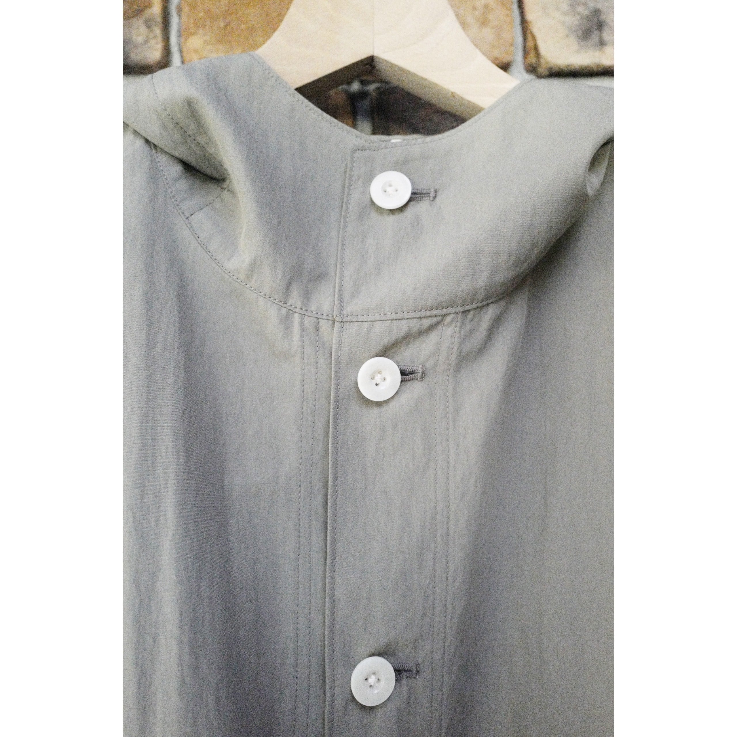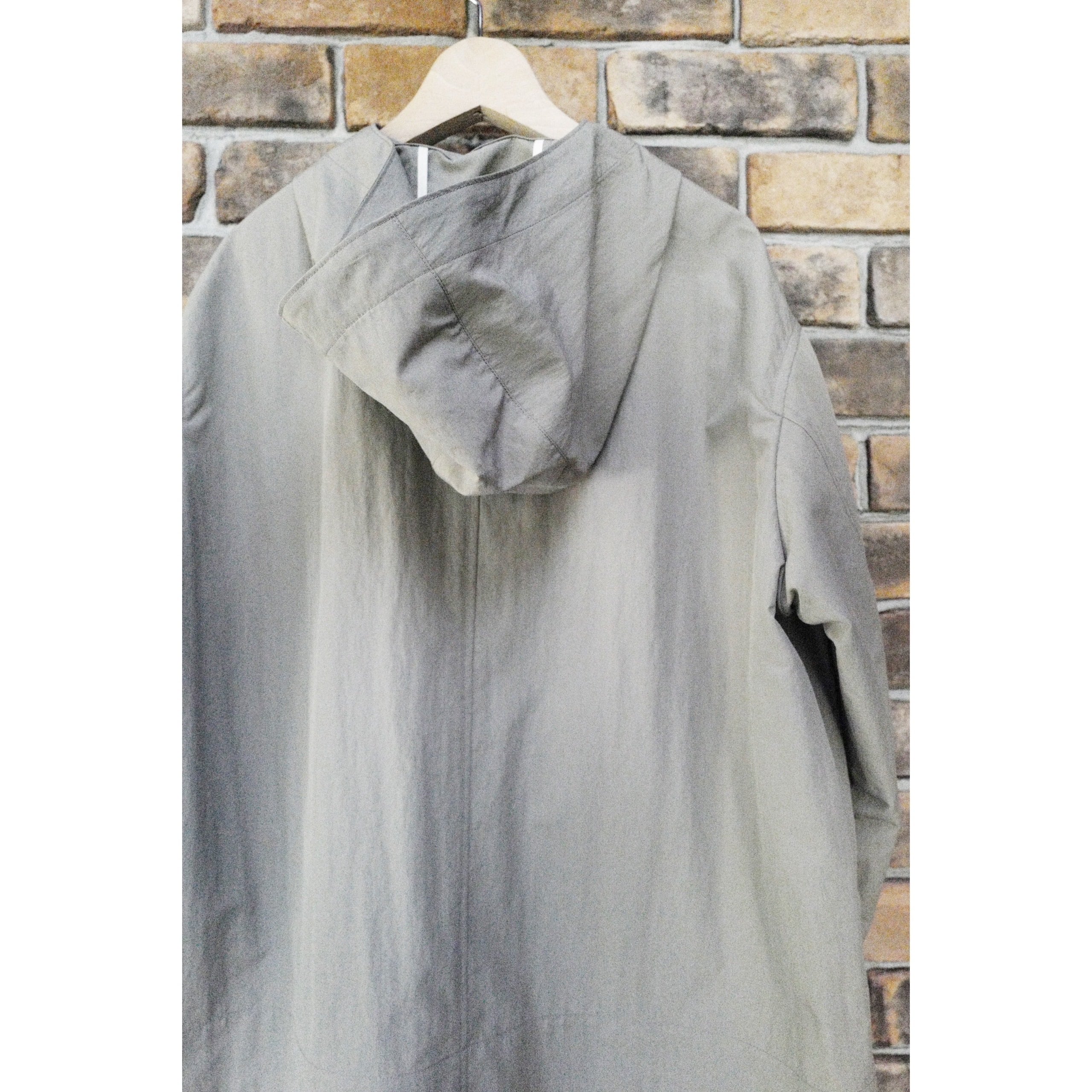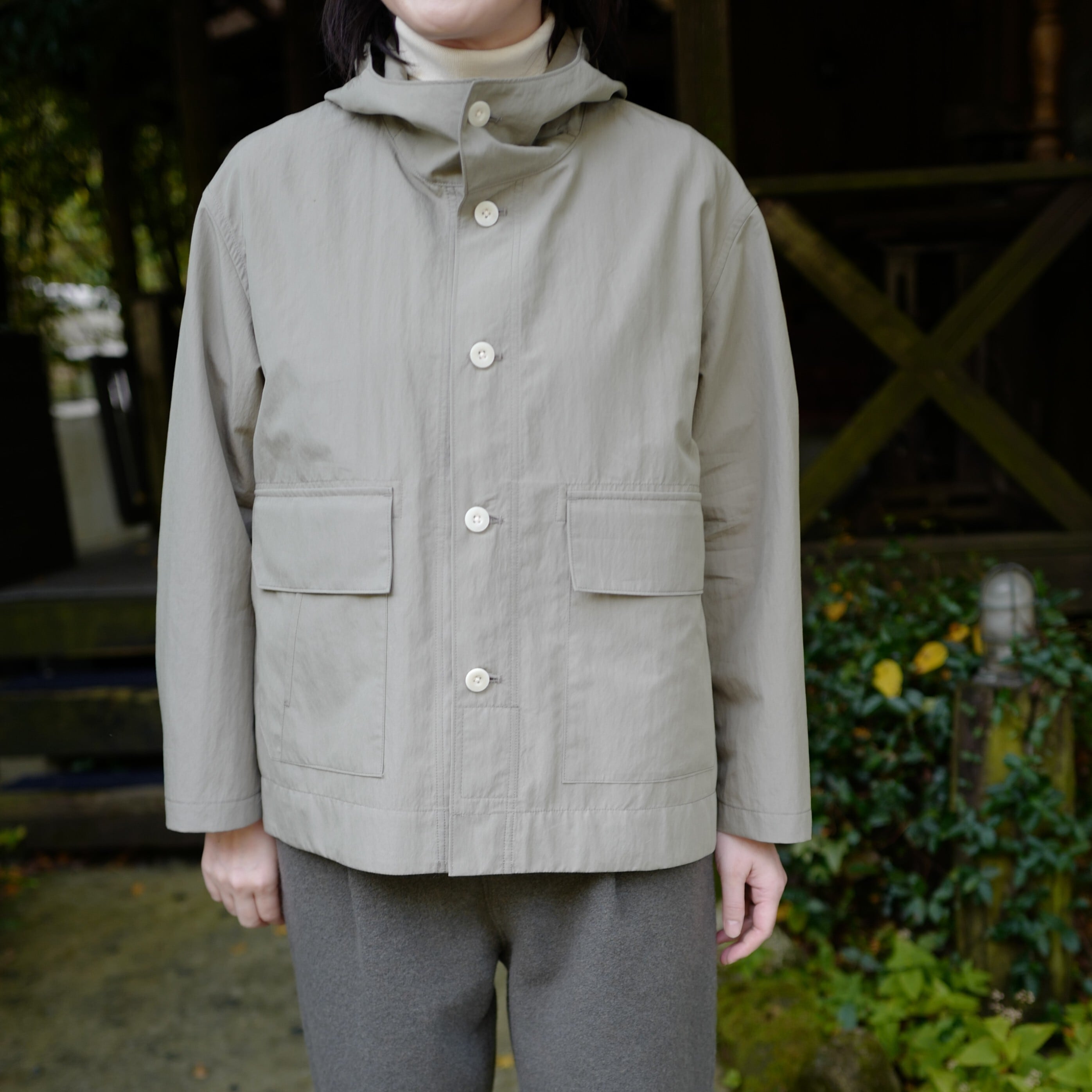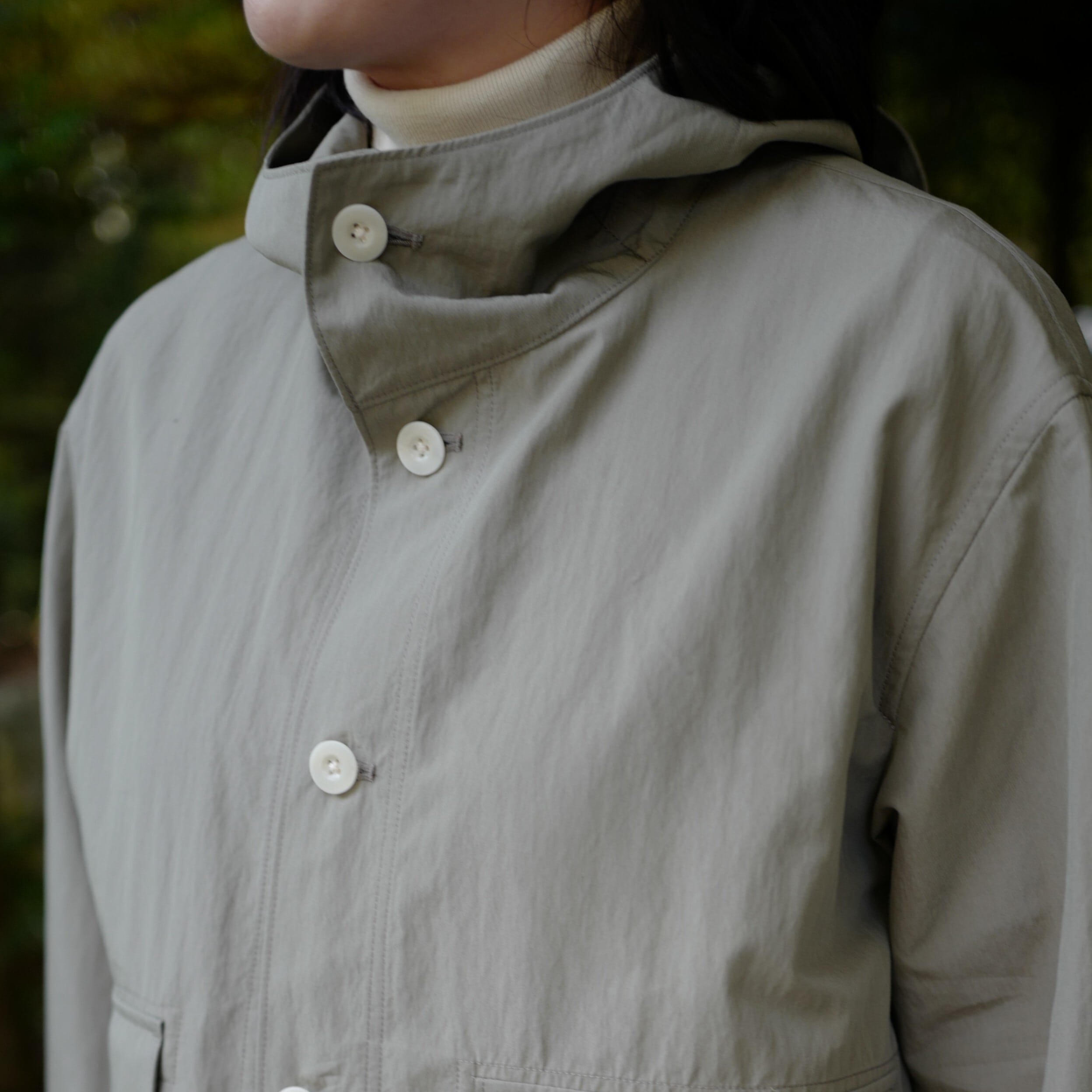 ボタンを上まで留めると首元もカバーできるスタンドカラーのフード付きデザインで、着丈に少し前後差をつけ、お尻が隠れる使い勝手の良い着丈。(身長166cmでお尻がぎりぎり隠れる着丈です)