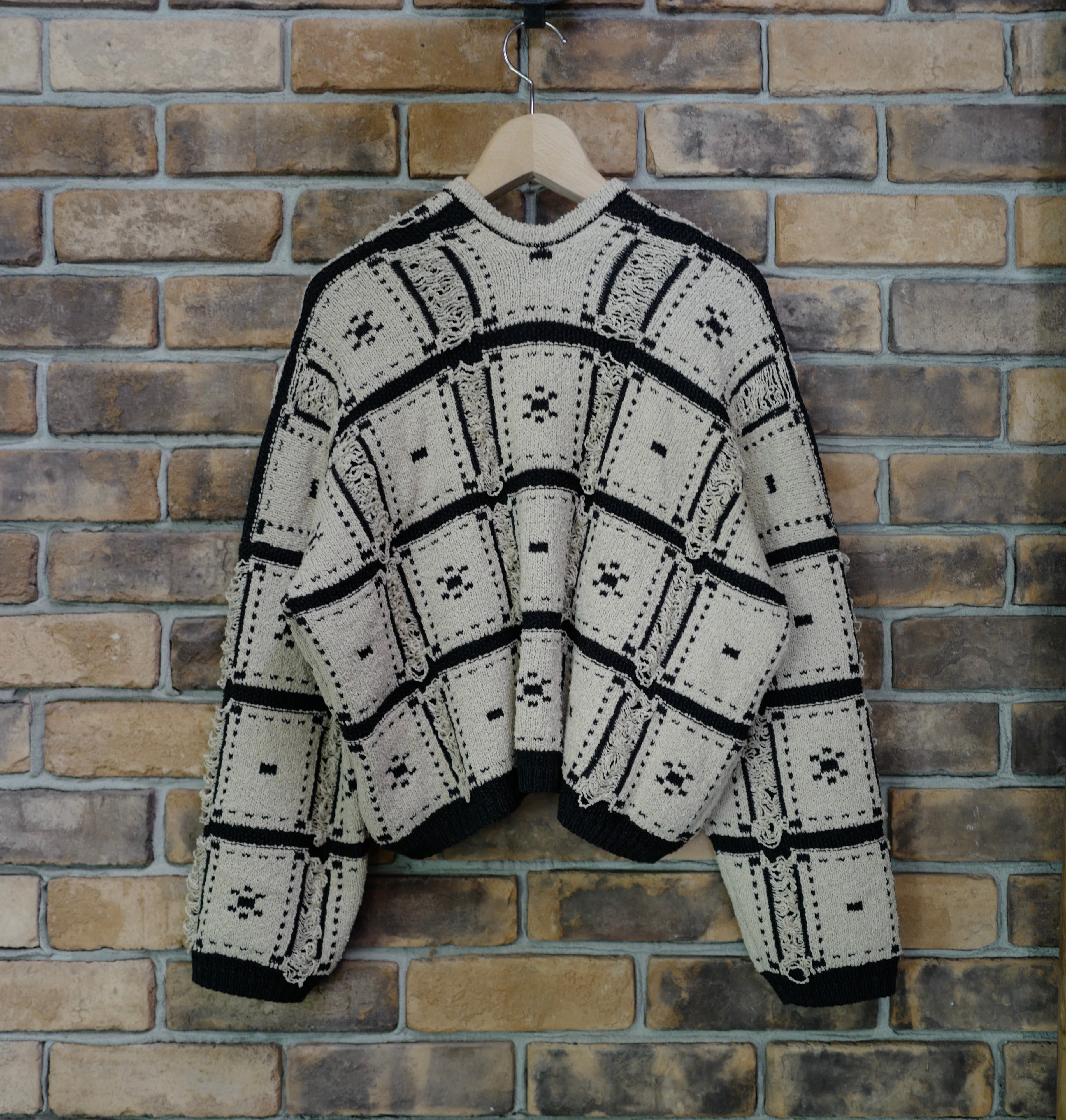 正方形のパーツをパッチワークのように並べて組み合わせたようなデザインが楽しい一枚です。