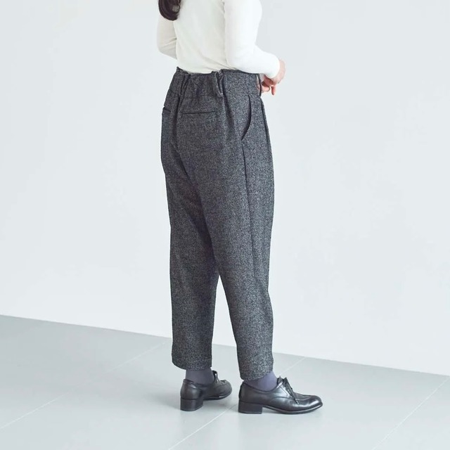 秋冬らしいツイードの生地で作った、カジュアルな中にもきちんと感のある9分丈のテーパードパンツ。