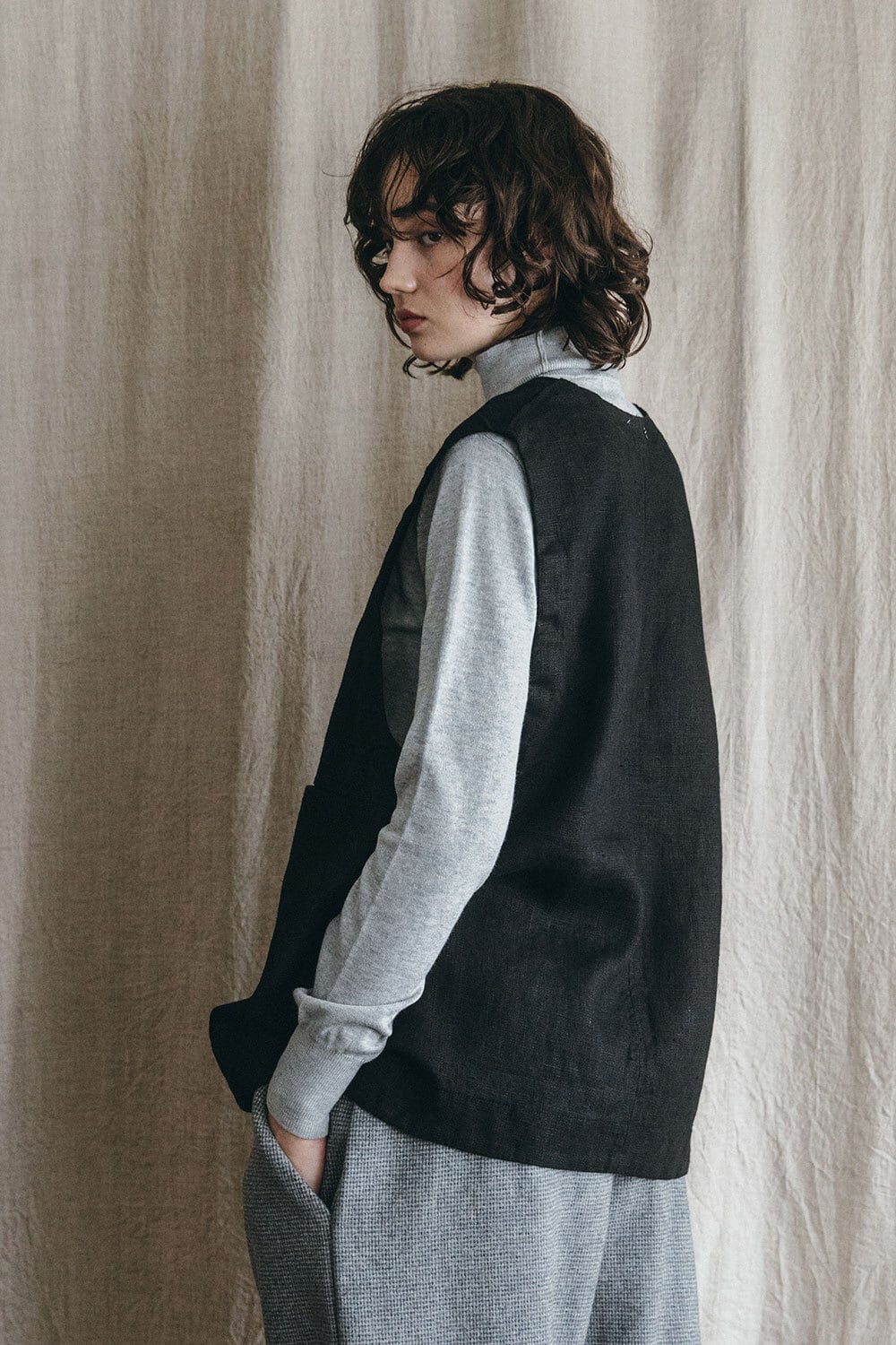 厚手のリネン生地で仕立てた、存在感のあるジレ。