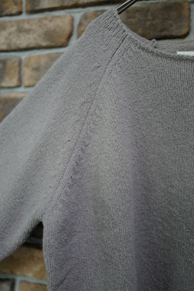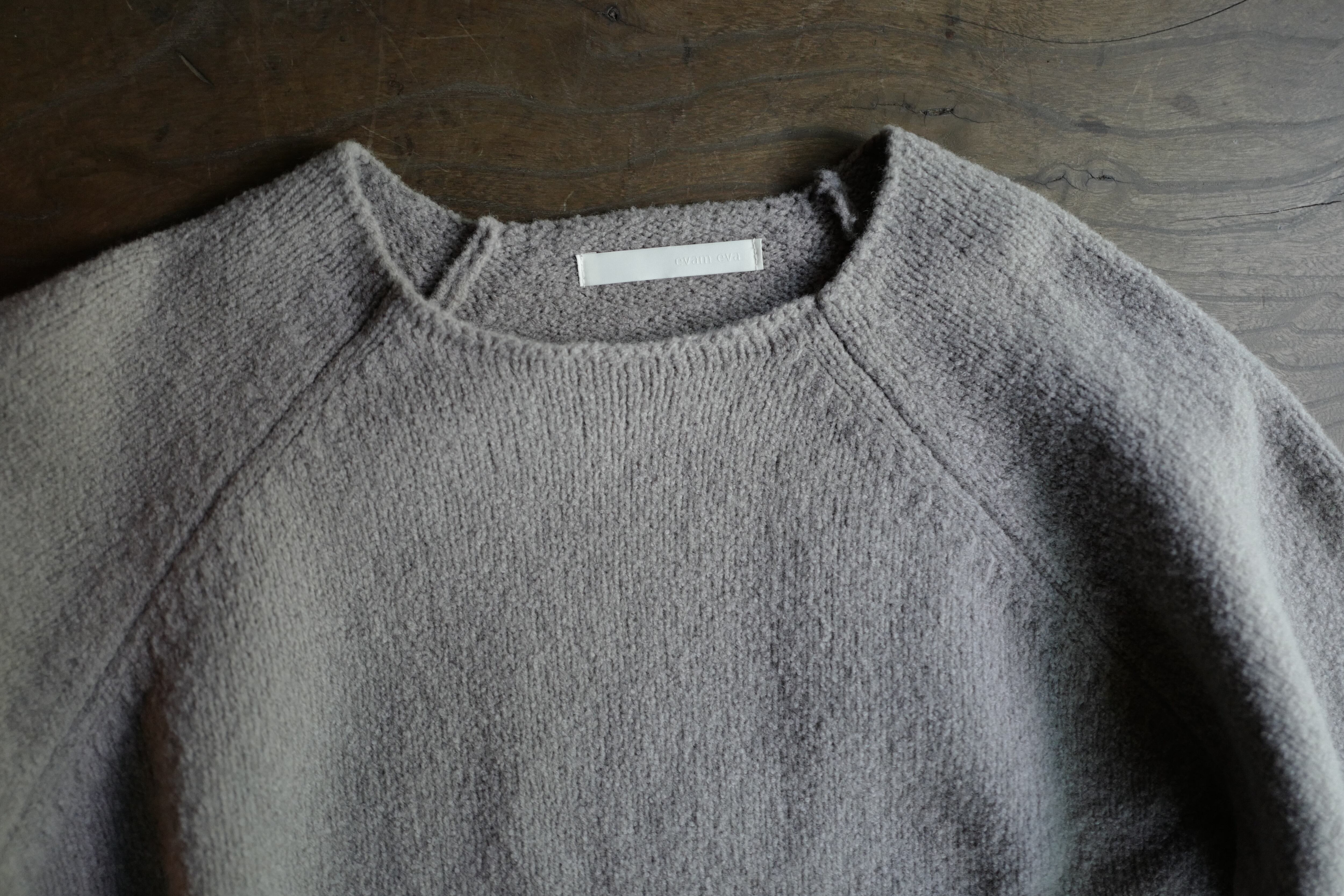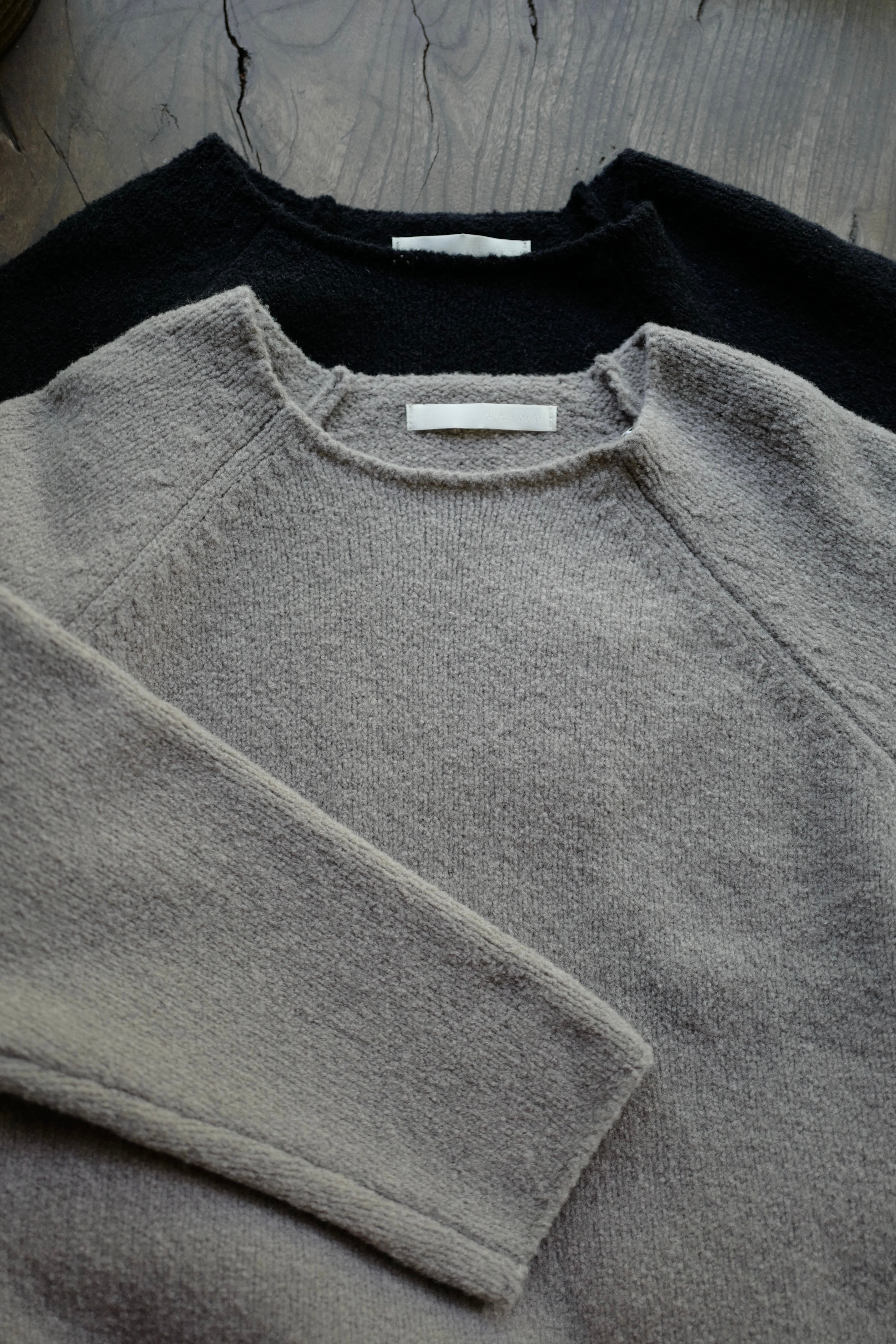 ウールの連続した細かいループ糸と組み合わせ、編地に密度がありながら、軽さと暖かみのある糸を作りました。