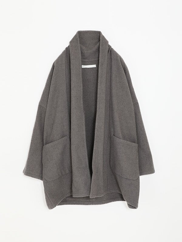 左右に便利な張りポケットを配しながら、首元はショールカラーで縦に流れるようなシルエットに。