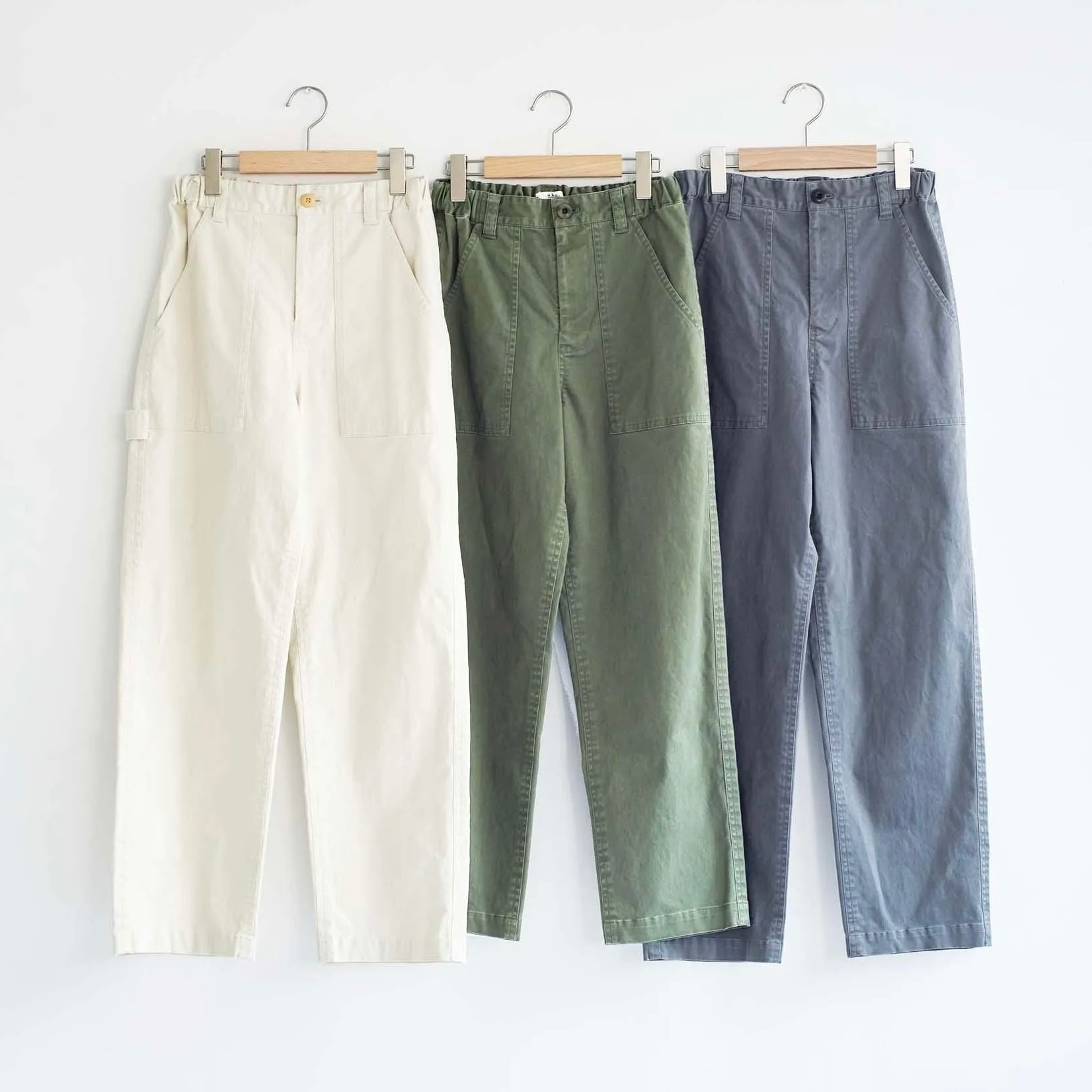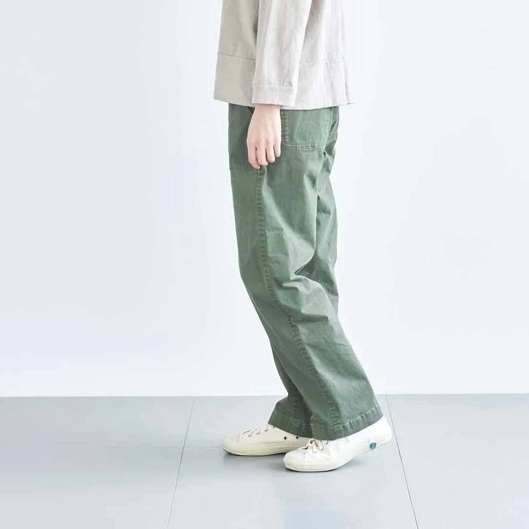 コットンベースの素材にストレッチを効かせたサテン生地を採用し、ディディールやステッチ使いをワークテイストに仕上げた、 HAU の新たな定番パンツです。