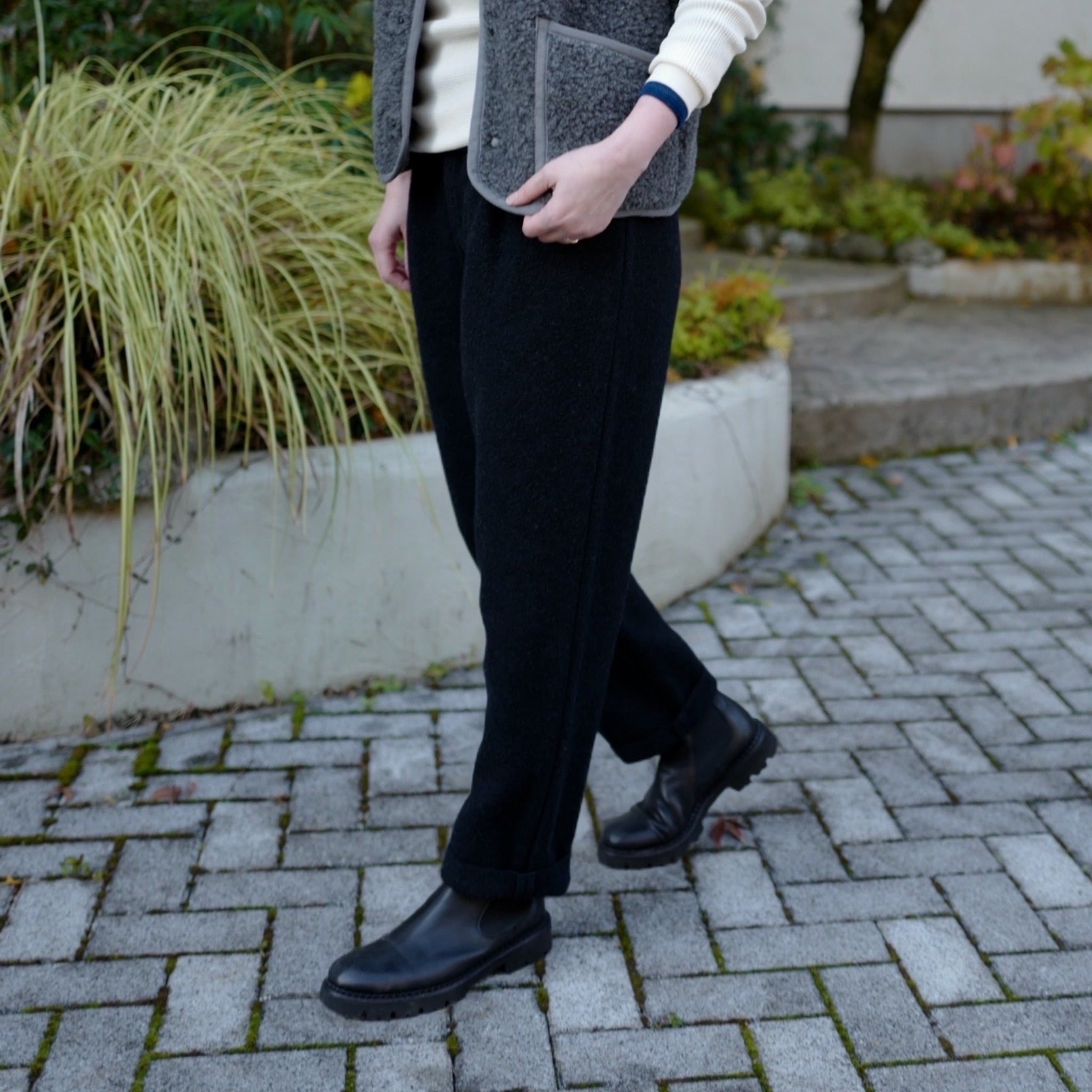 毎シーズンお取り扱いしているこちらのパンツ、厚みがあるので重い印象にならないよう、裾はメロー始末で軽やかに。