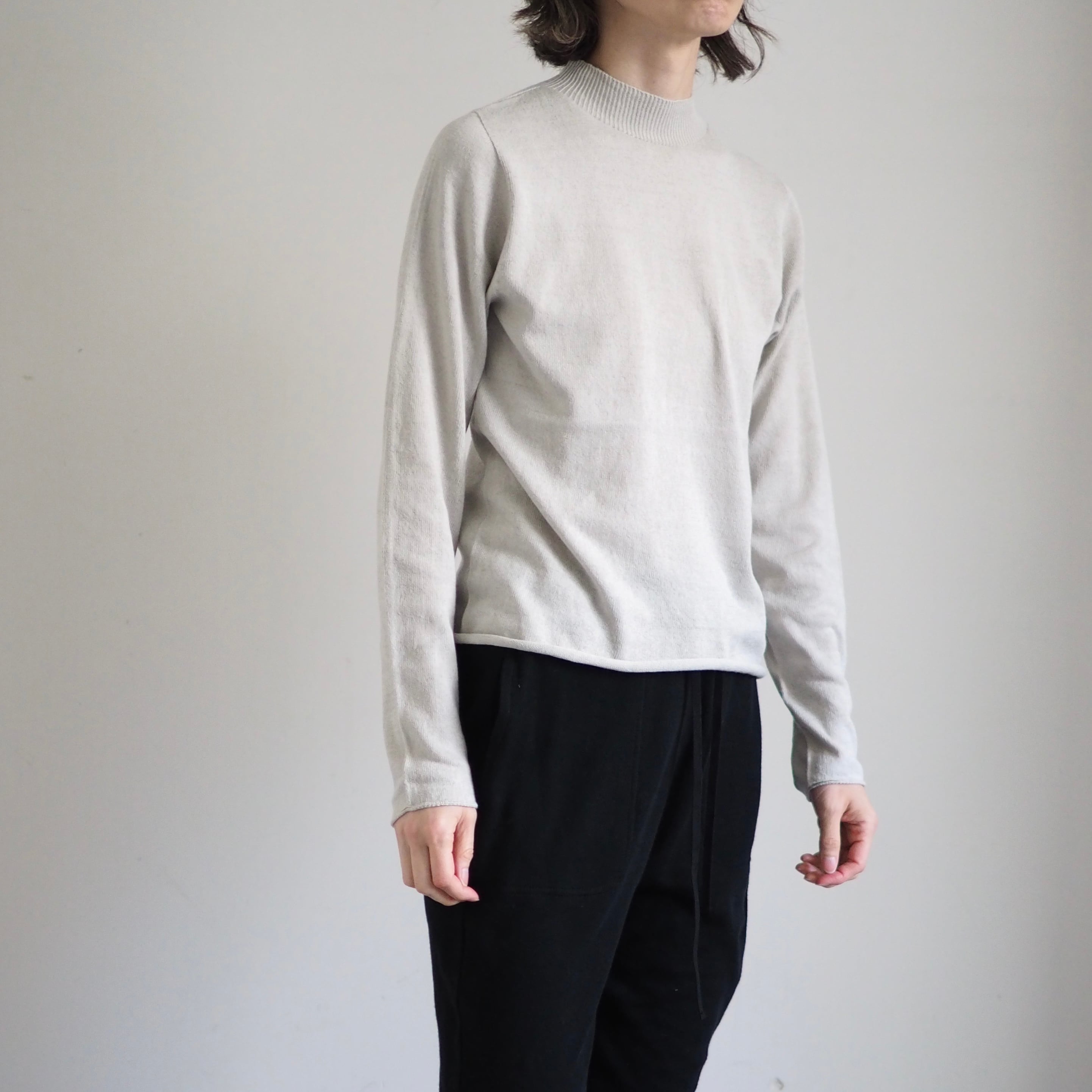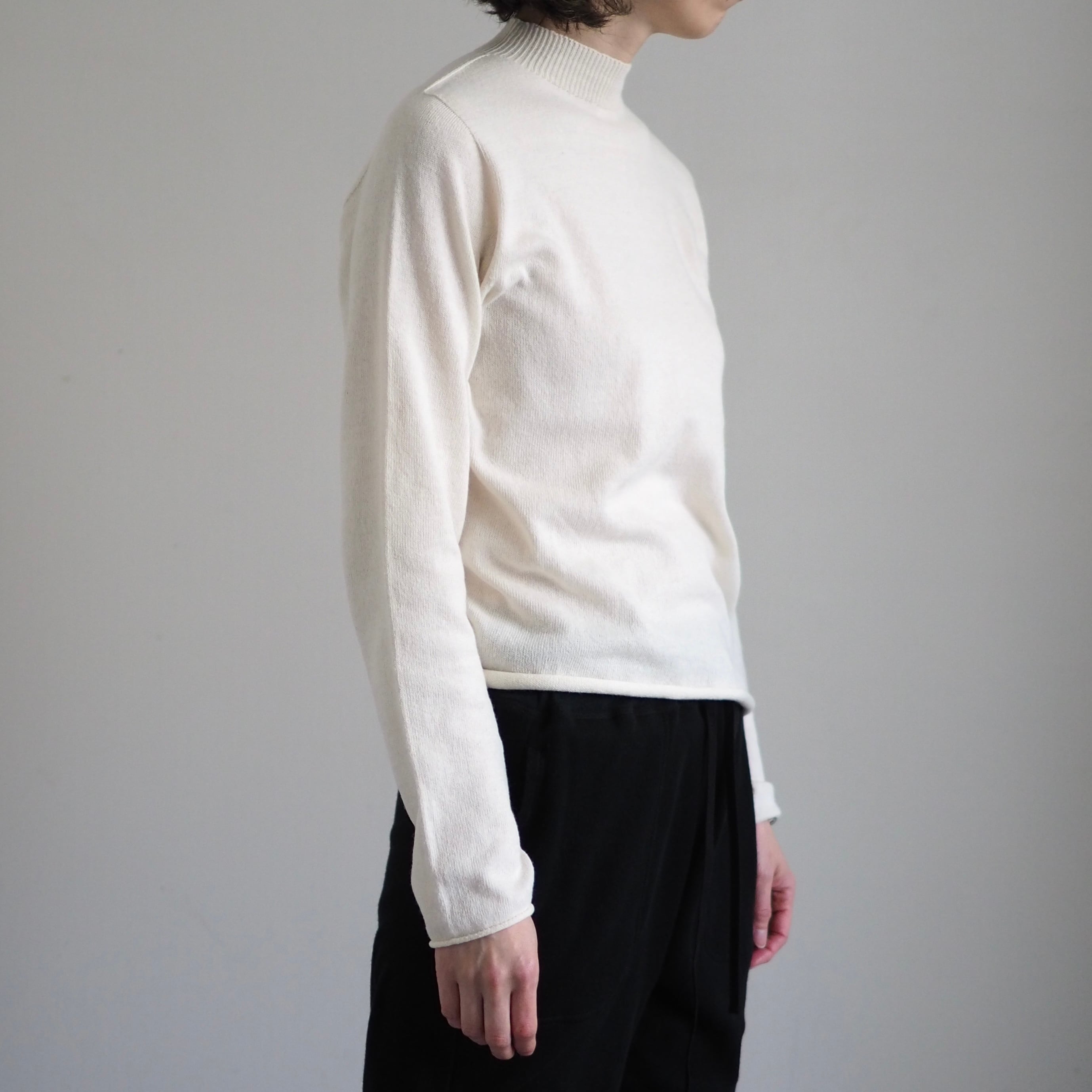 リブ編みで少しの高さのハーフネックは、首元をすっときれいに見せてくれます。