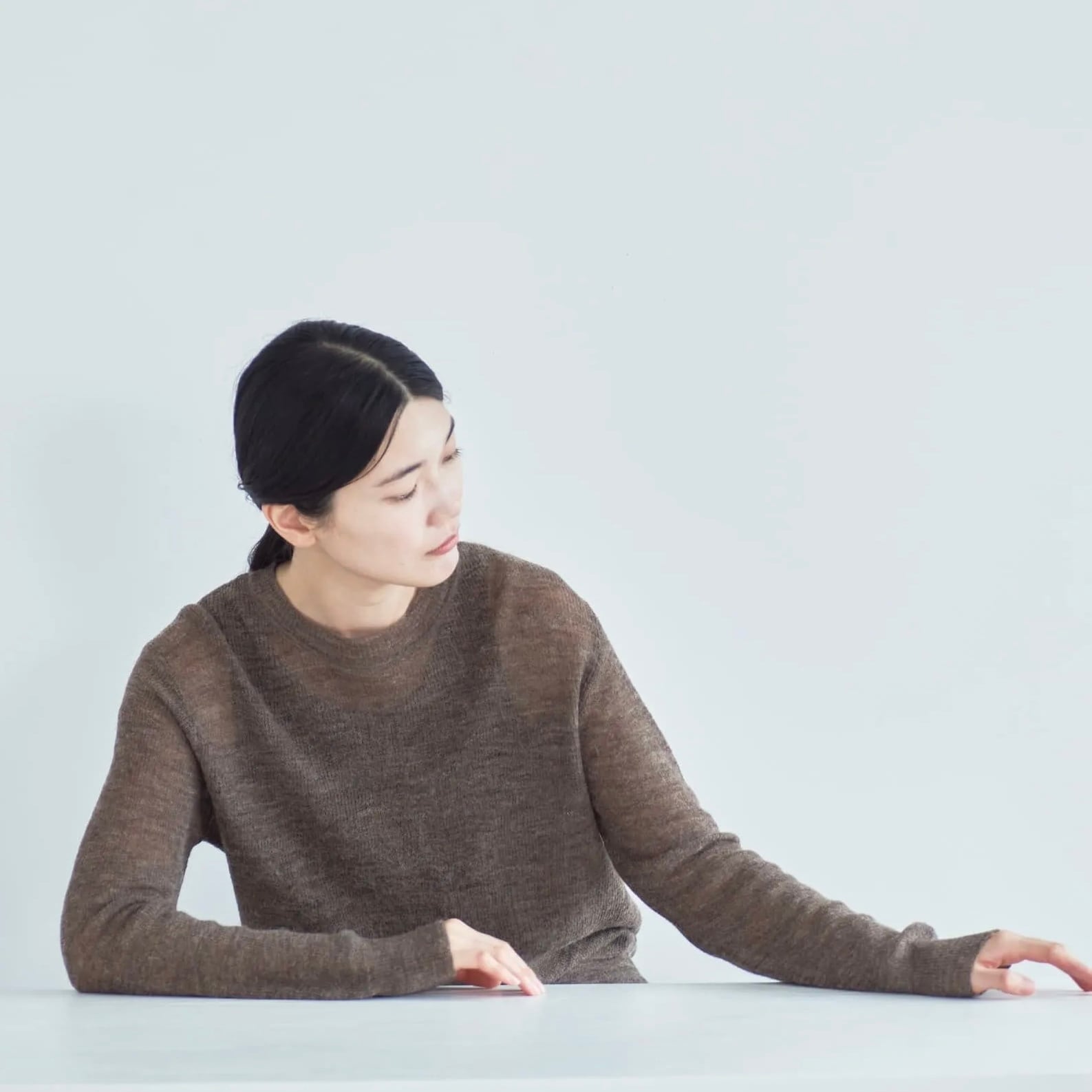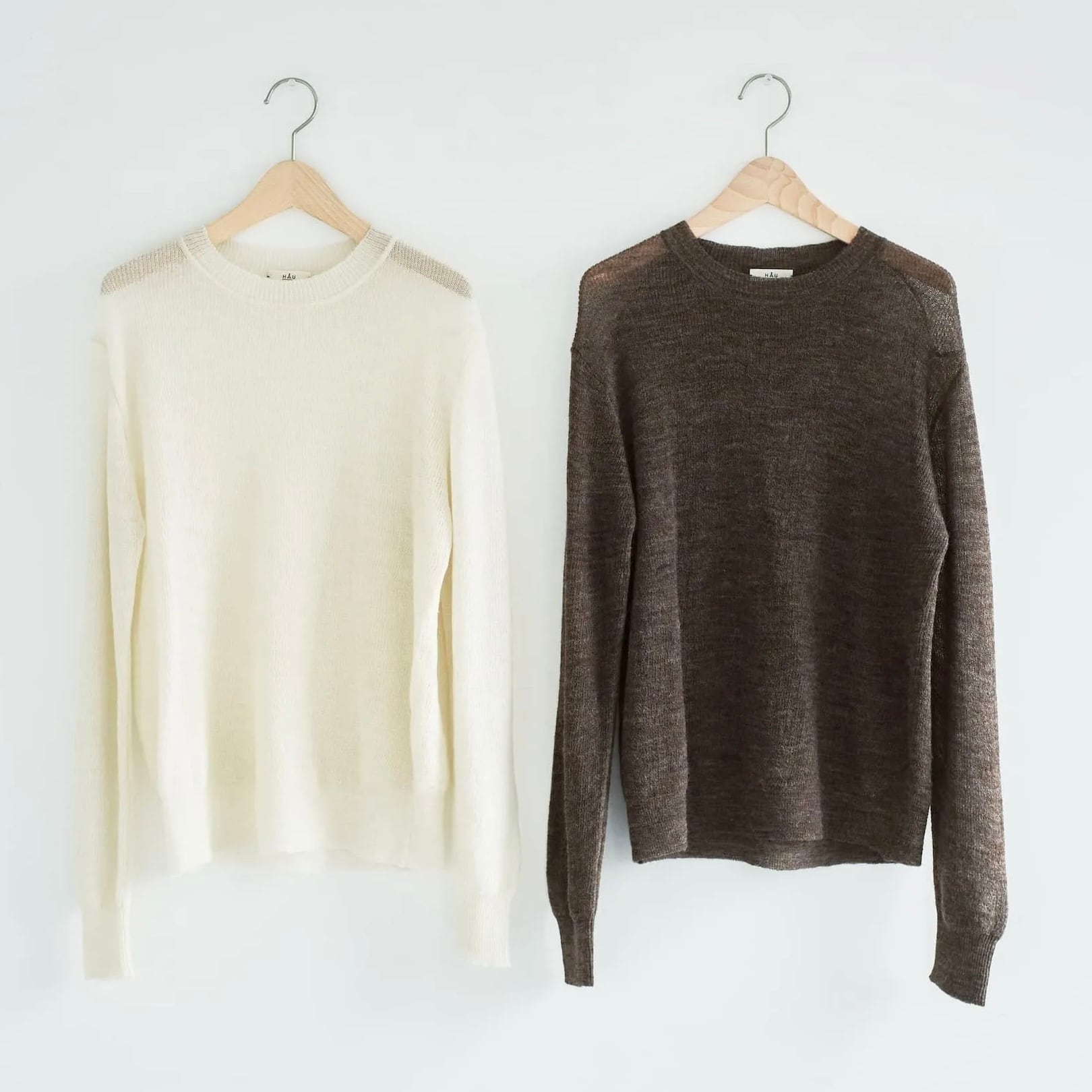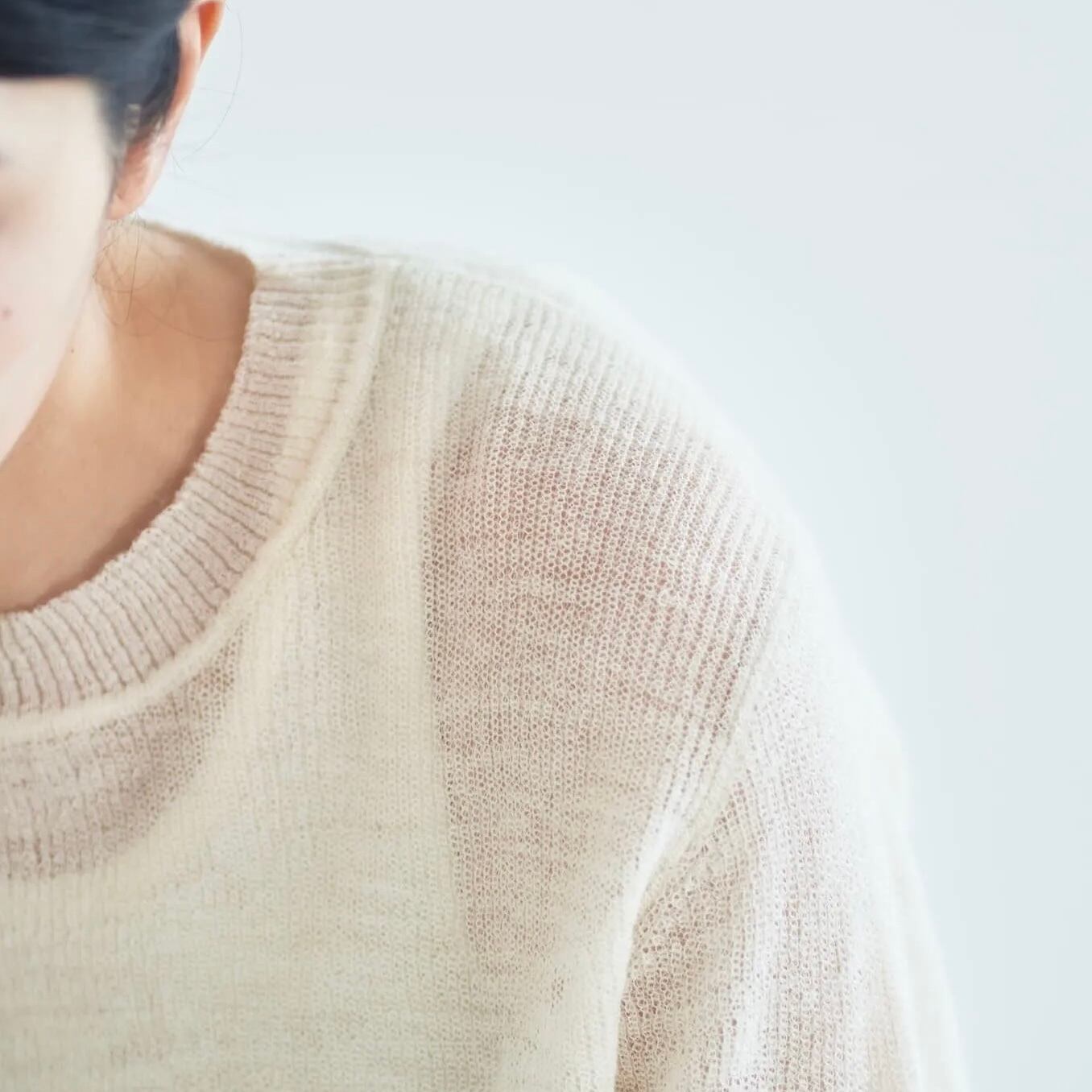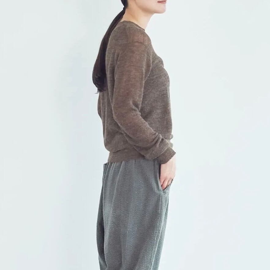 繊維の細いファインアルパカとウールの混紡糸を編み立てて作った、クルーネックのニット。
