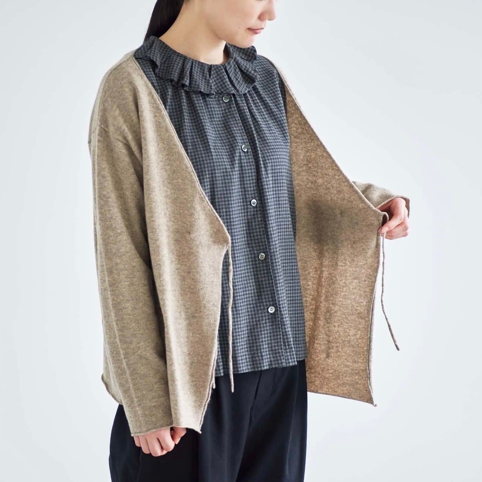 かたちは、シンプルなカーディガンとは一味違う、コーディネートの主役になりそうな羽織ものが欲しいという想いから、ポンチョのようなデザインが愛らしい、カシュクールタイプのニットカーディガンに。