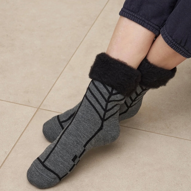 外側はメリヤス編み、中間はパイル編み、肌側は起毛の3重構造だからふかふかで足に優しいコージーな厚みになっています。