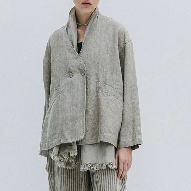 fogが「厚手リネン」と呼んでいる程よい厚みのあるリトアニアリネン生地で仕立てた、Vネックノーカラージャケット。