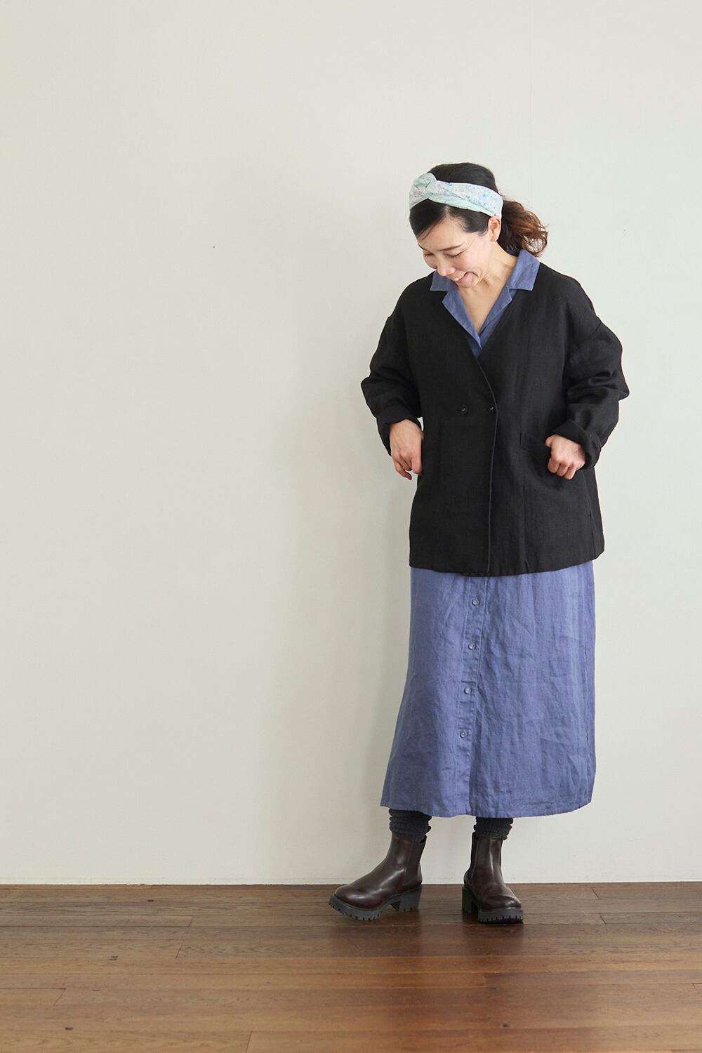 厚地リネンは、着て洗って経年変化で生地が柔らかくなっていくのも楽しめます。