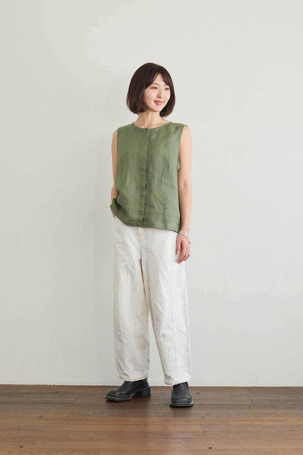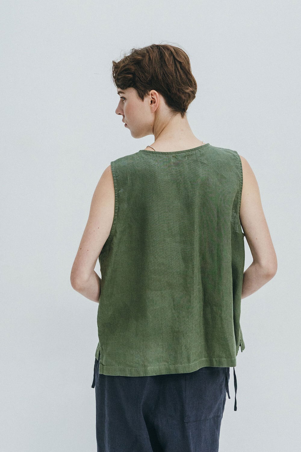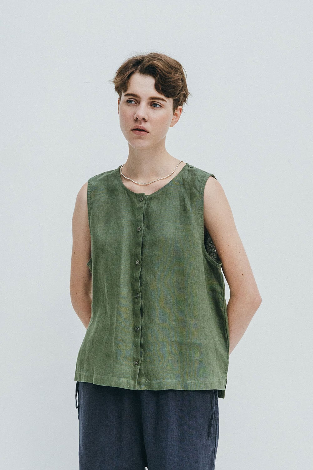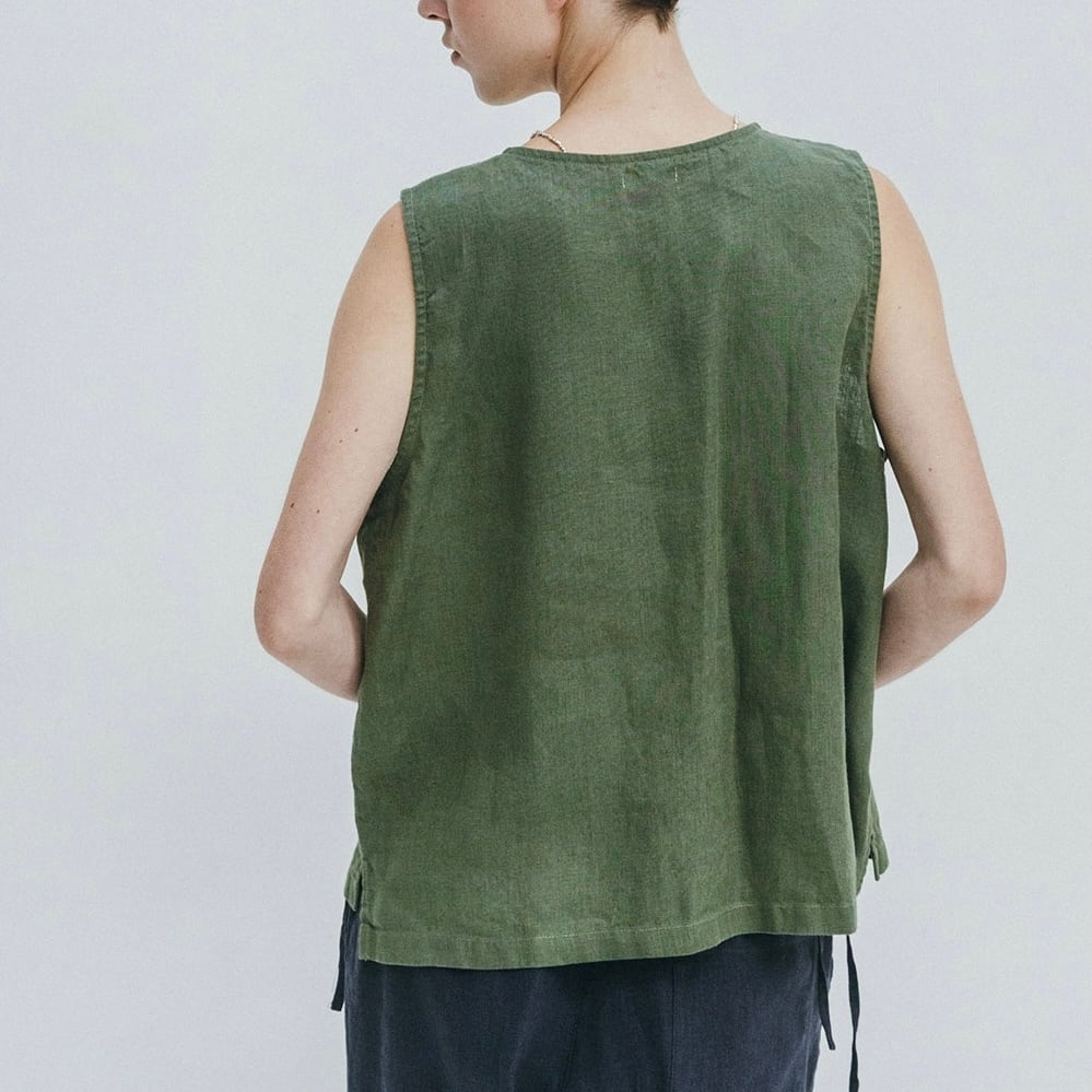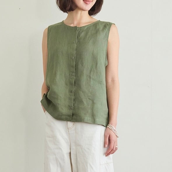 前開きのリネンベスト。