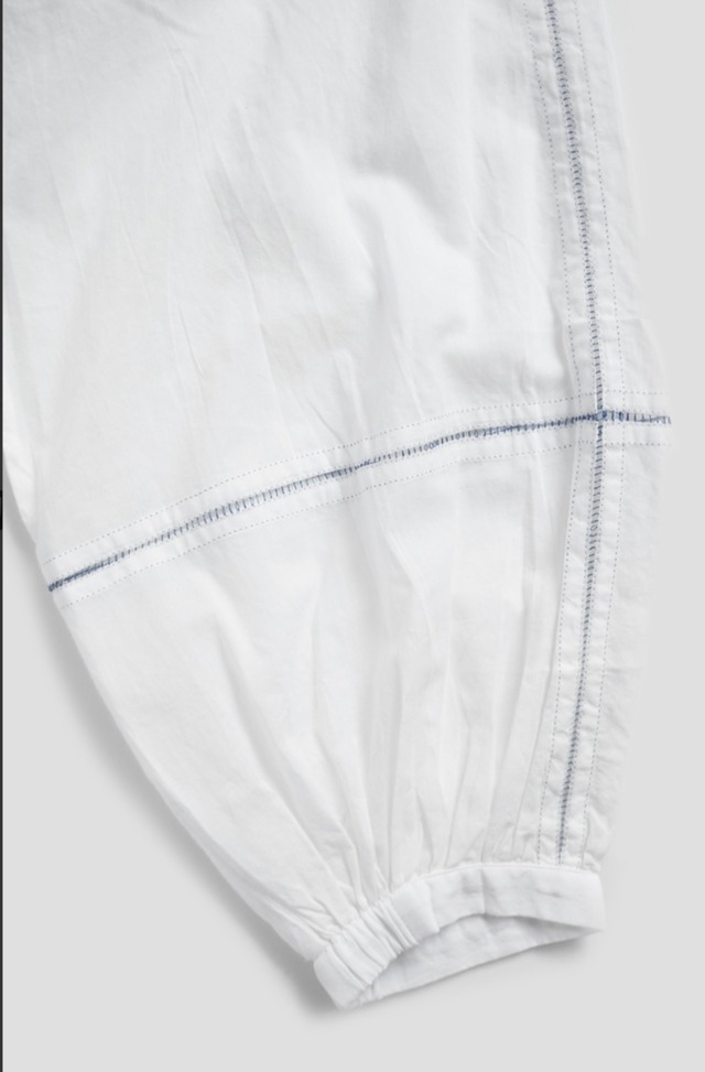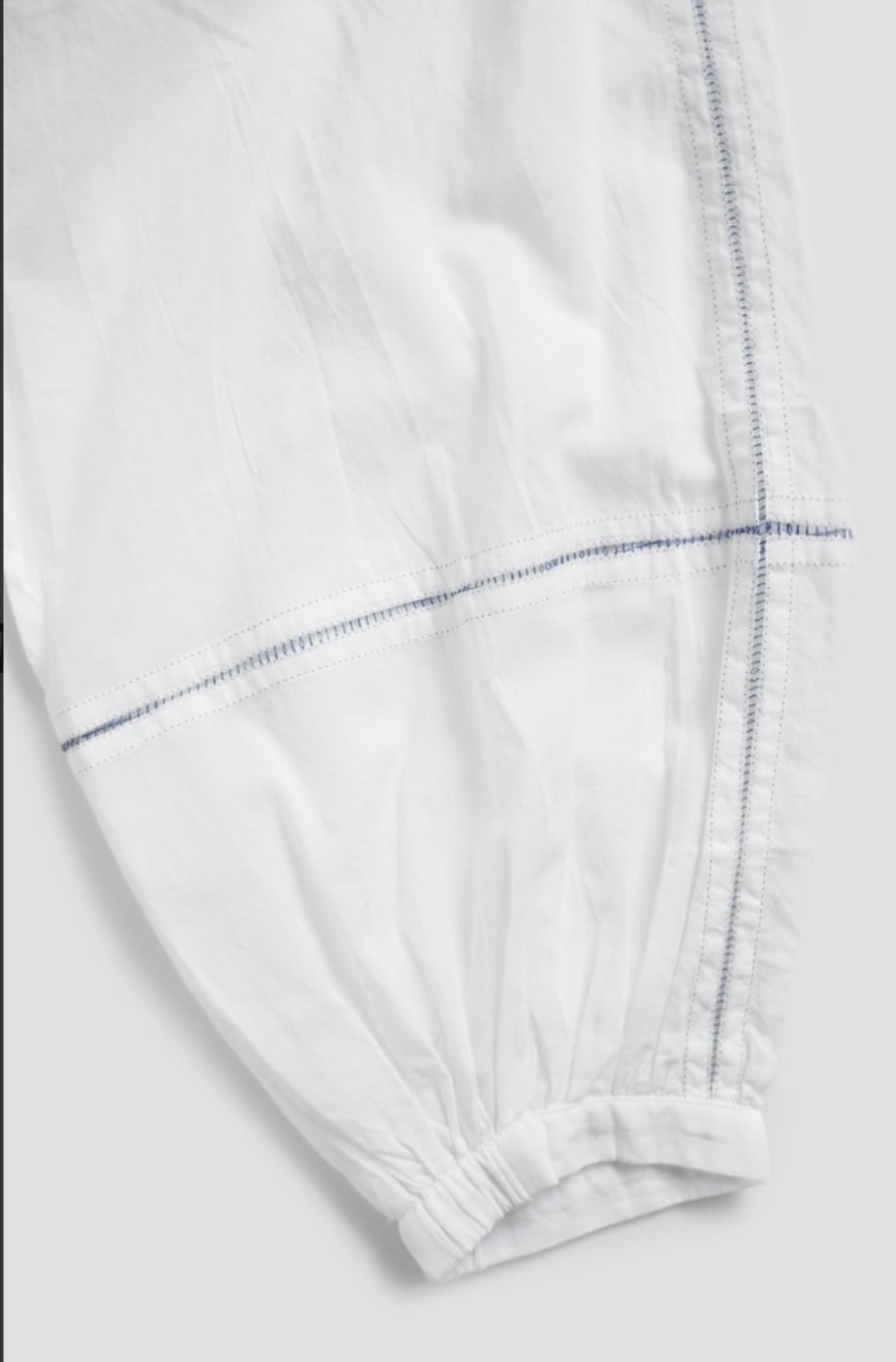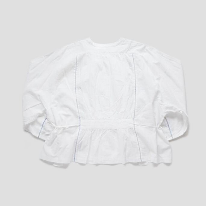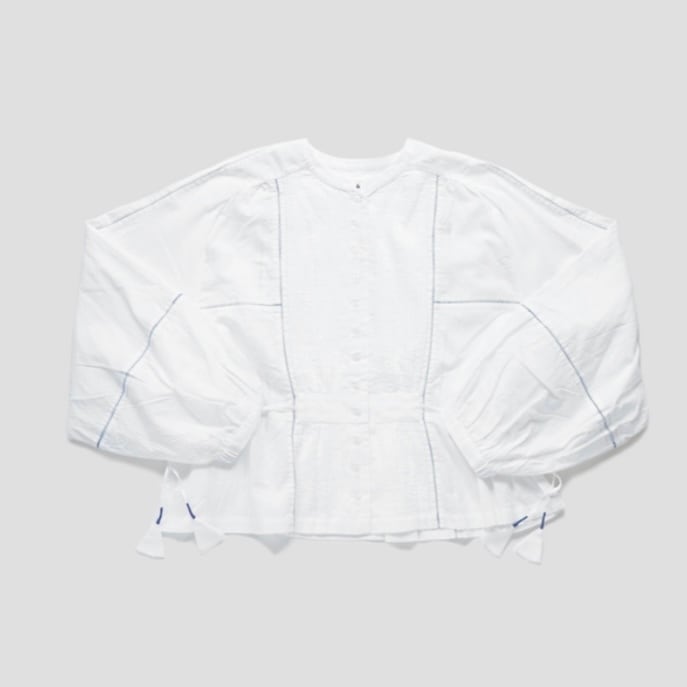 袖口ゴム仕様でたくし上げるとボリュームのあるパフスリーブに、高めのウエスト位置、細かなギャザーから生まれる立体的なシルエットが、存在感を生んでいます。