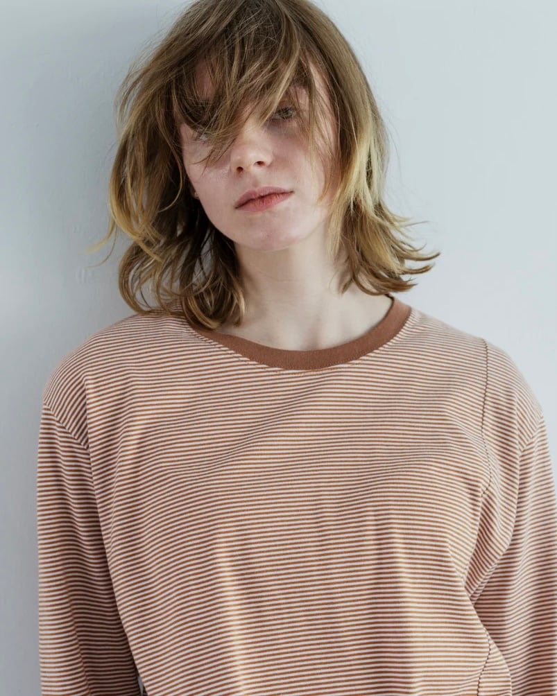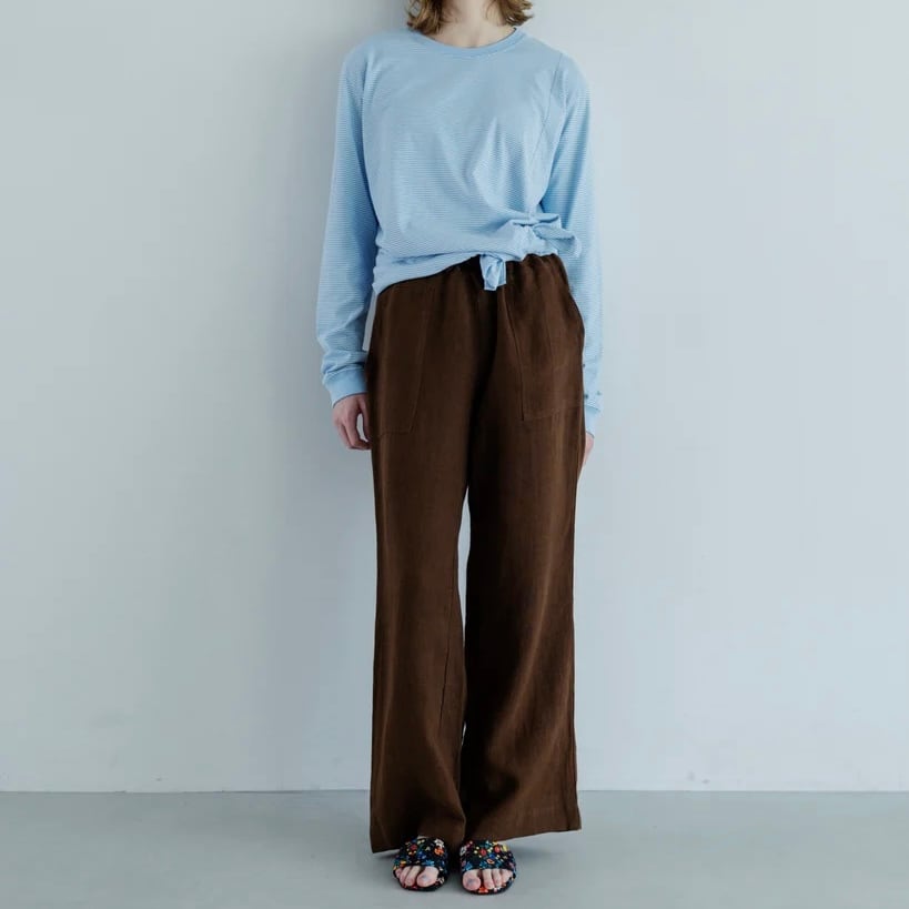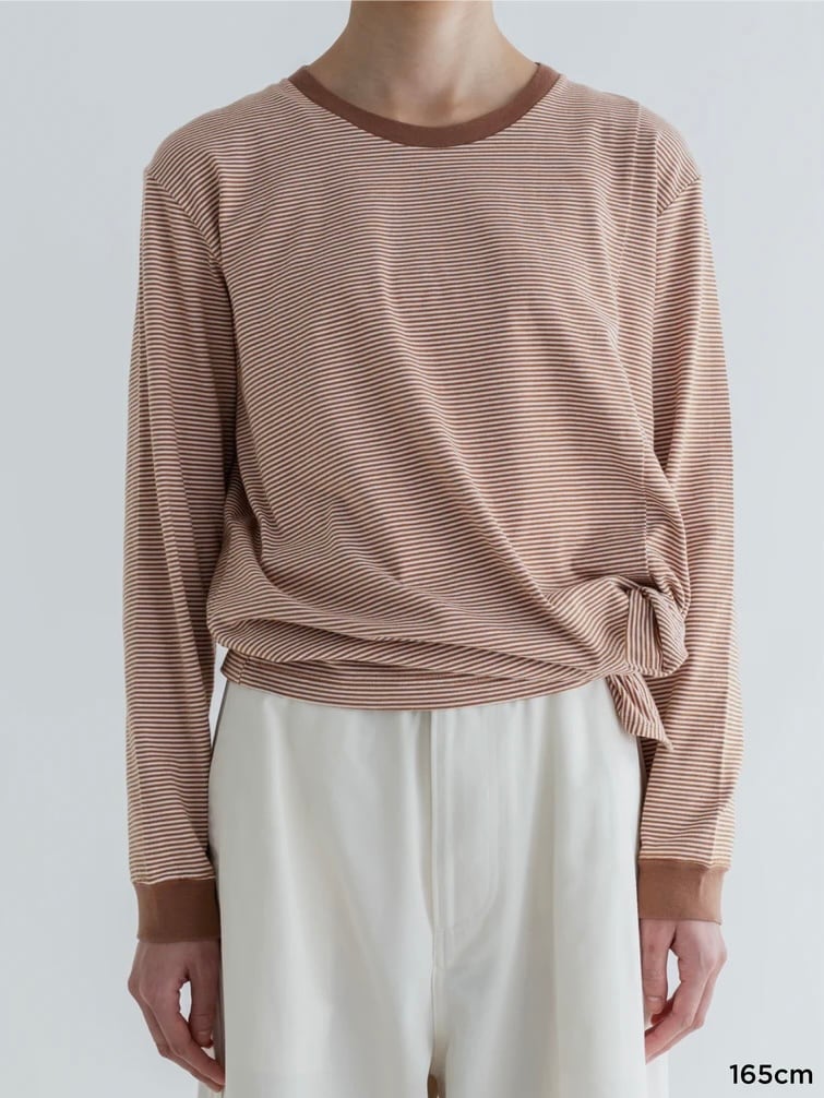 一見無地に見えるような細い幅の繊細なボーダーで、カジュアルになりすぎないように作られています。