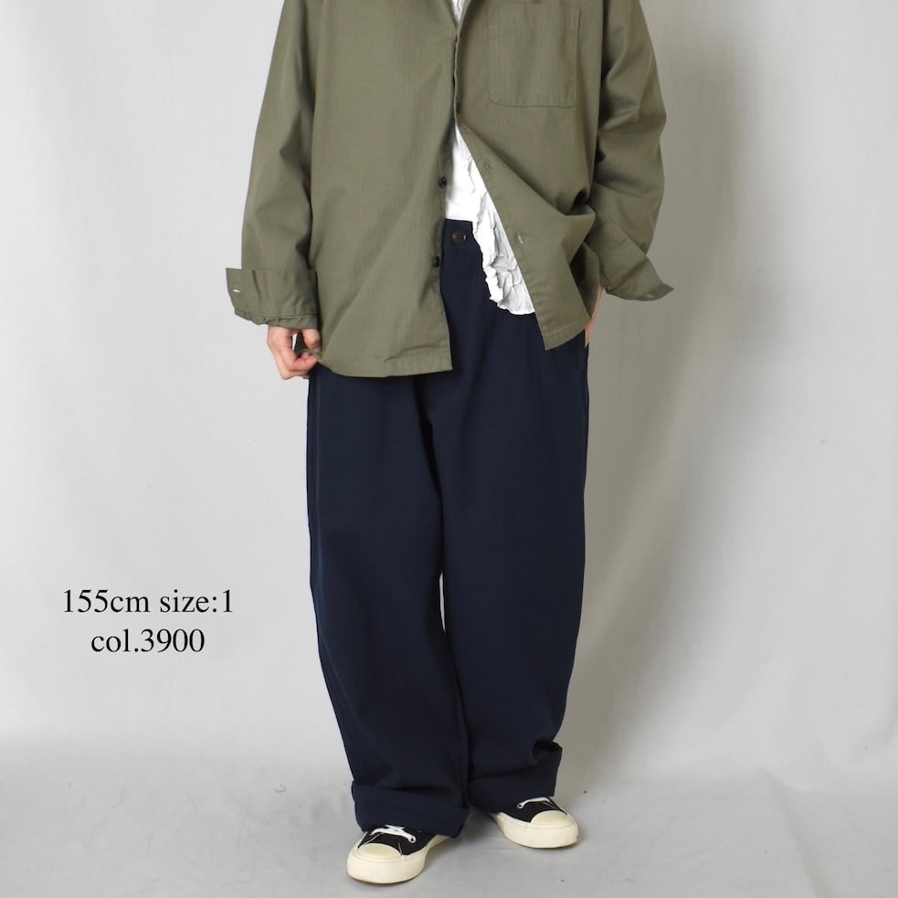 ワンタックの入ったウエストから、裾に向かって僅かにテーパードする太めのシルエット。