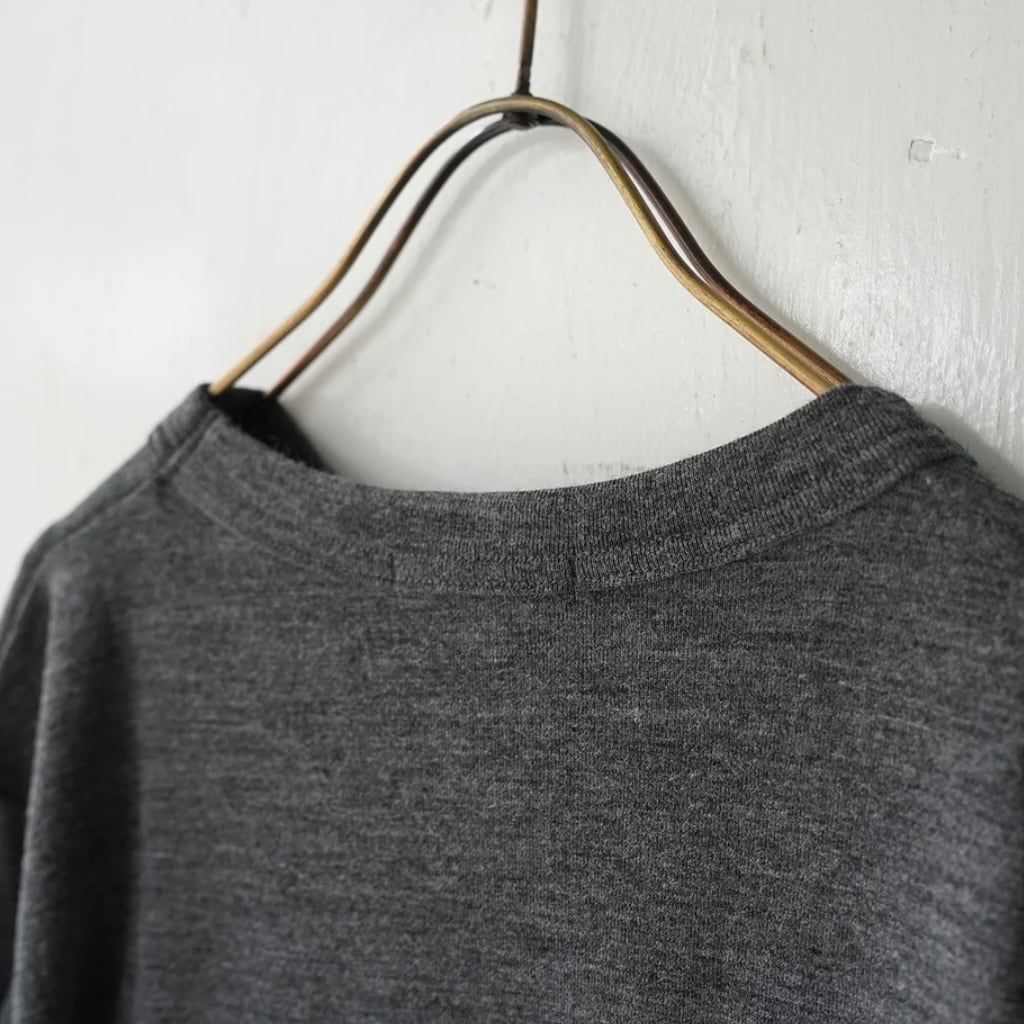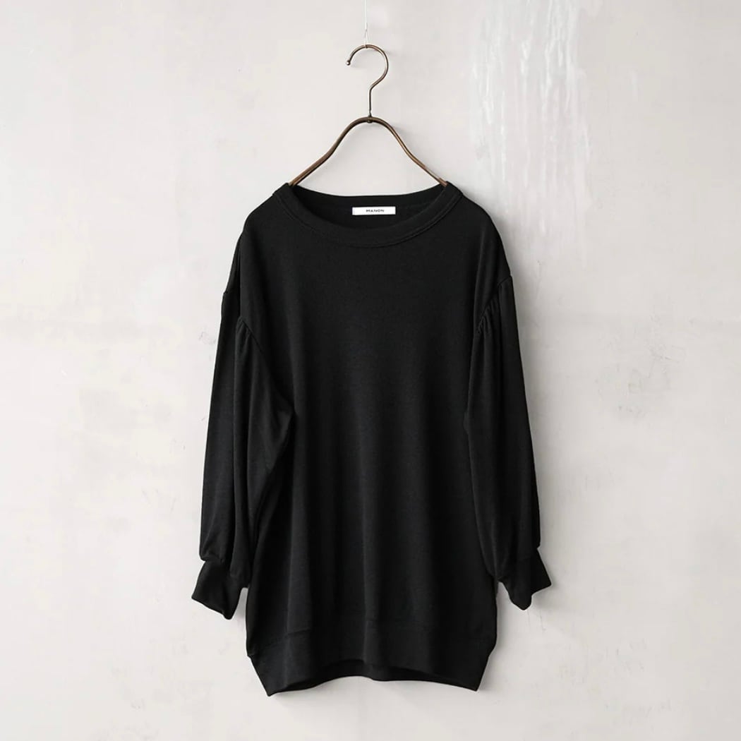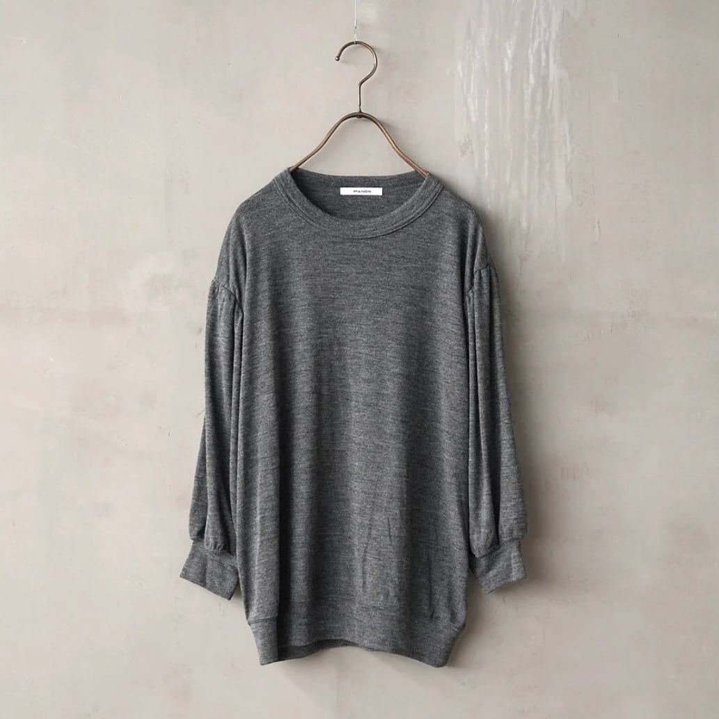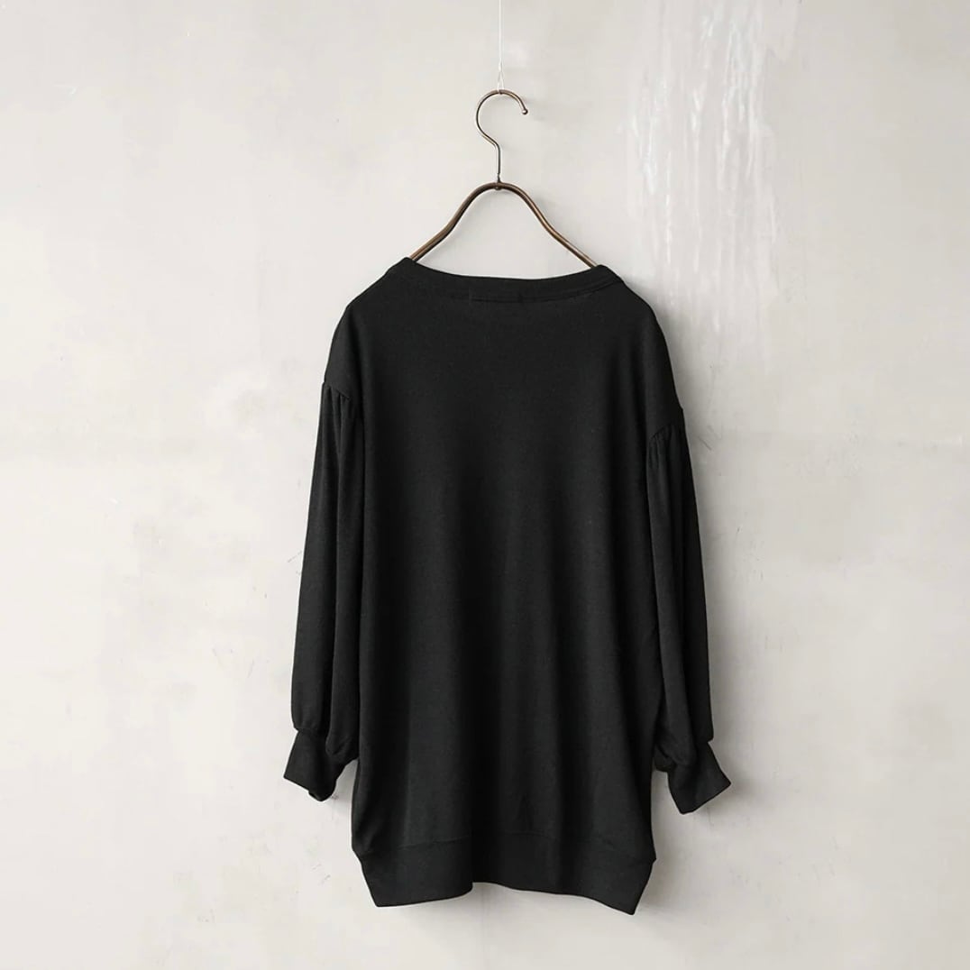 衿ぐりは詰まりすぎないクルーネックで、袖は膨らみを出した袖に仕上げています。