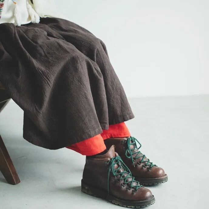 独特の皺の立体的な表情とボリューム感が魅力ですので、腰張りやお尻による広がりも映えてくれます。(ボリューム感が苦手な方は、薄地タイプをお選びください)