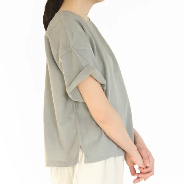 綿麻でさらっと軽く、肩が落ちたデザインで、ゆったりとした身幅やサイドスリットのおかげで動きやすく、外出着にも部屋着にも快適です。