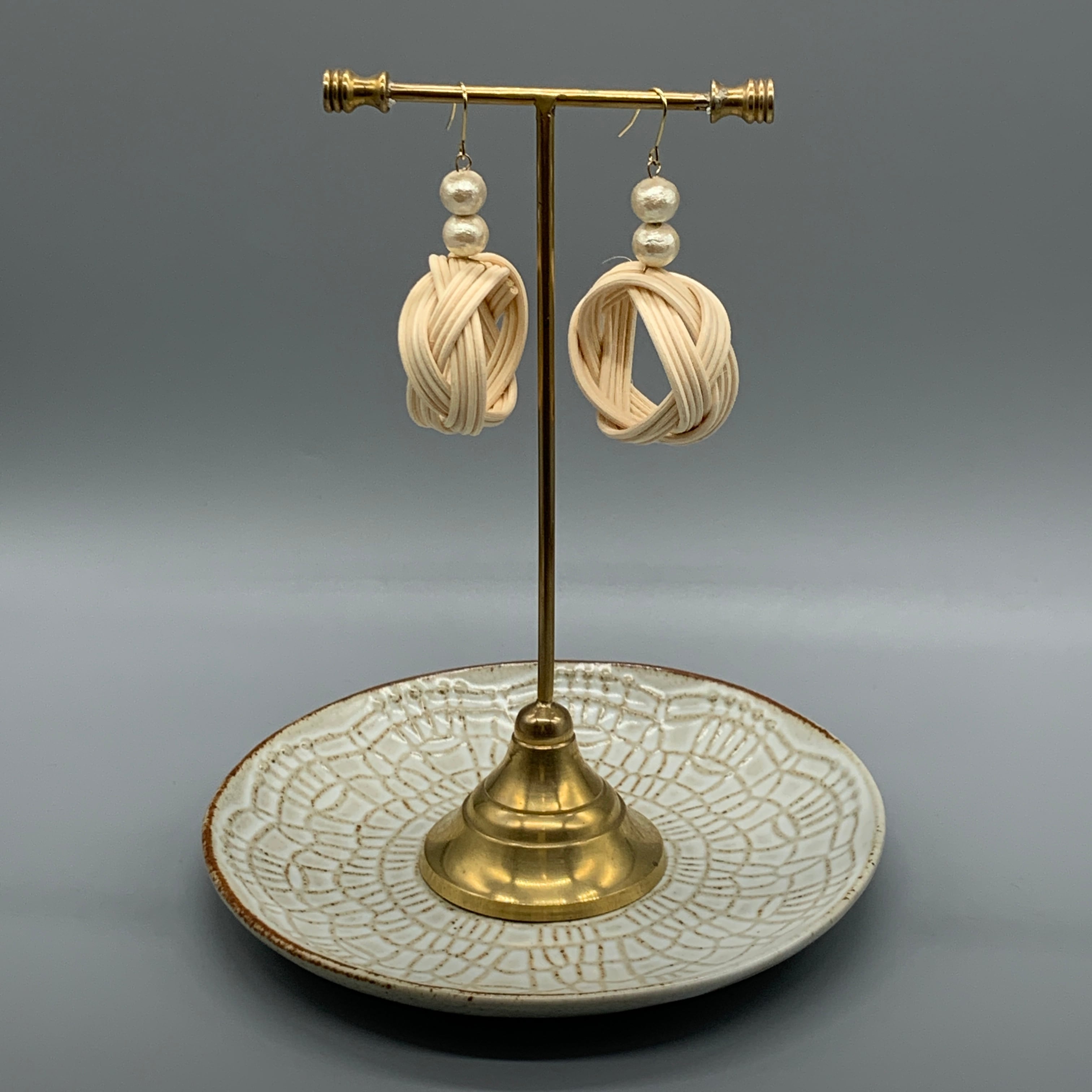 ラタン(籐)を丸く編み、コットンパールと組み合わせたピアス。