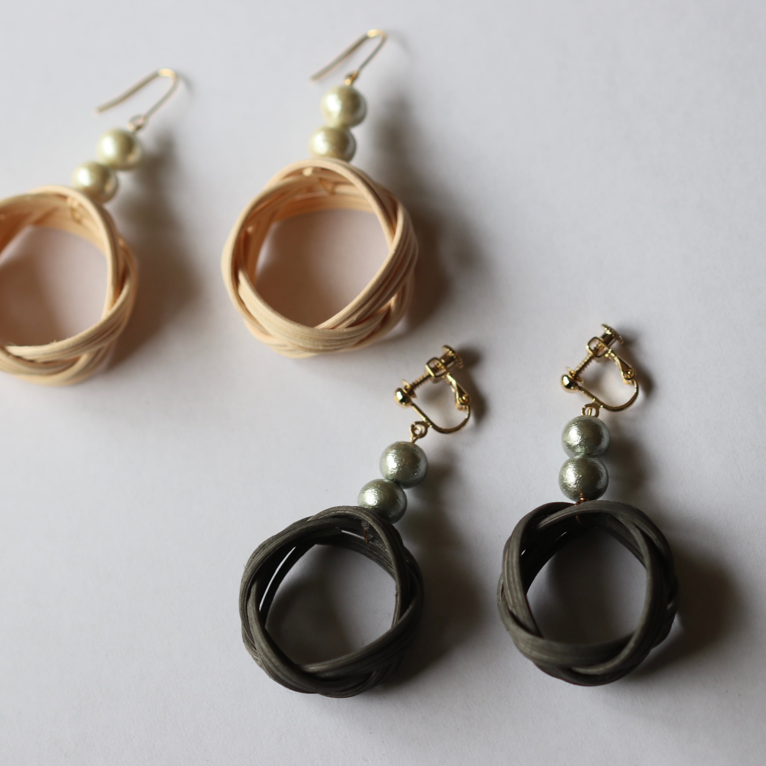 ラタン(籐)を丸く編み、コットンパールと組み合わせたピアス。