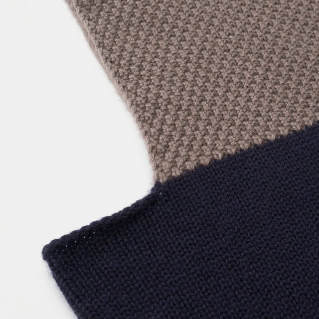 ネイビーとモカのバイカラーのデザインで、すっぽり首を通すだけ。