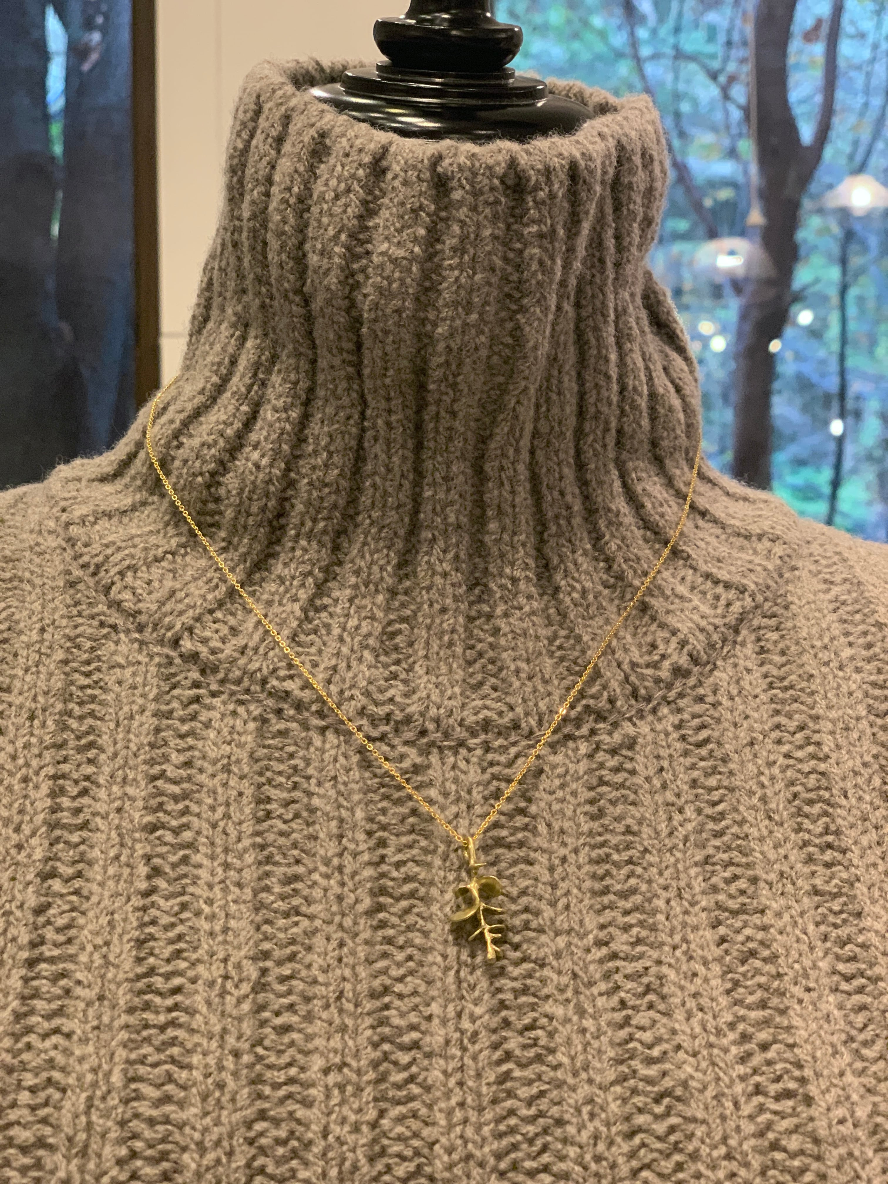 葉に丸みのあるグニユーカリをモチーフにした、真鍮製のネックレスです。