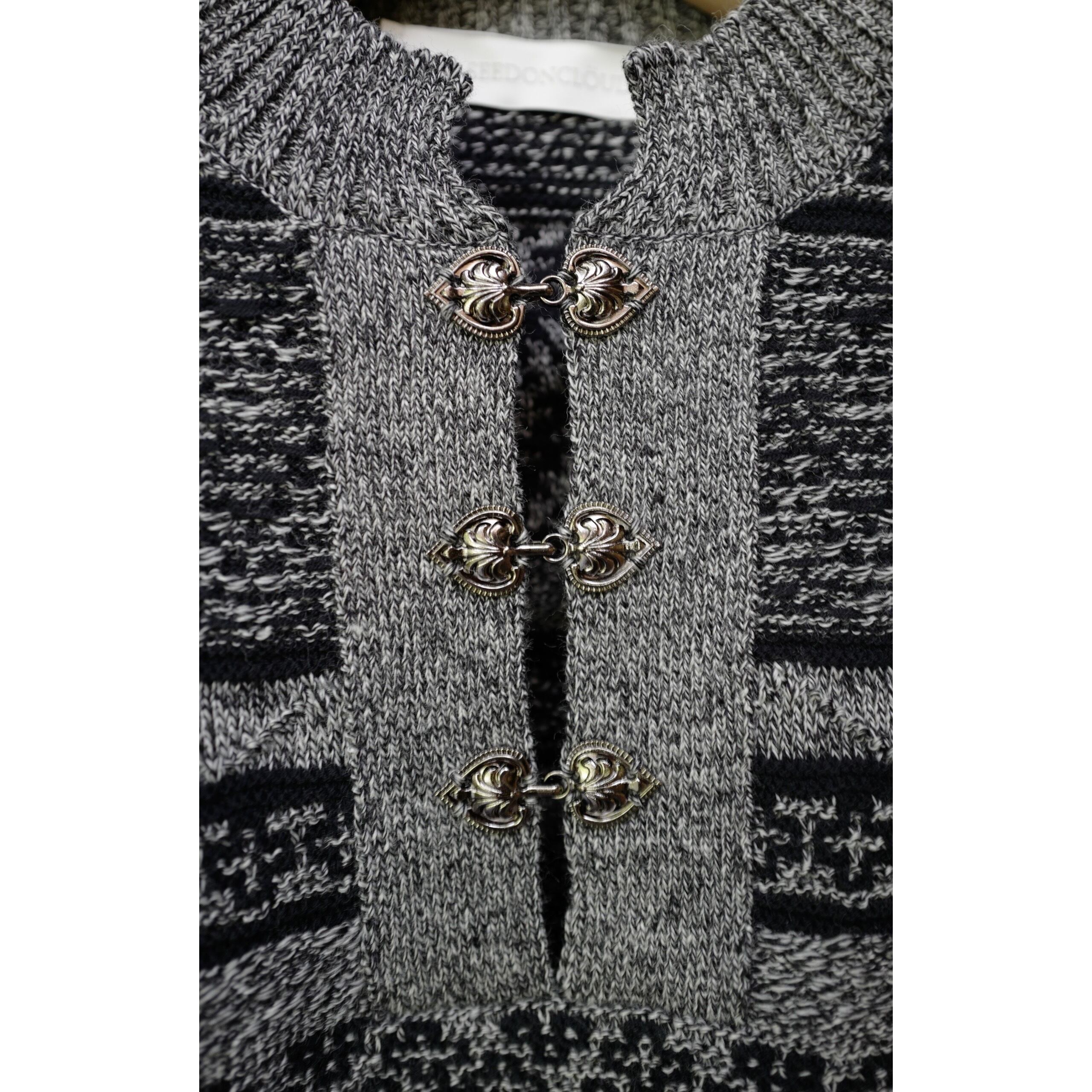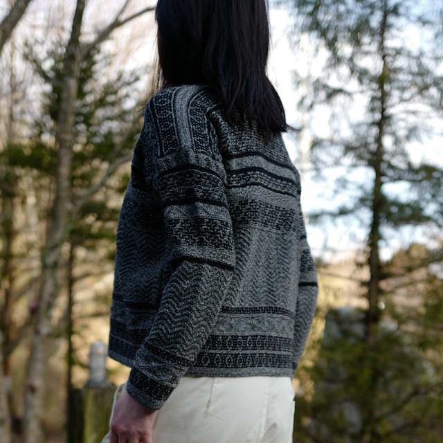 今回のストーリーは、冬に雪山で霧を取集するようなイメージが強かったため例年以上にノルディックニットの要素を足したく、フック状のメタルボタンを使用したり、吹雪いている雪のような伝統柄の「ルース・コスタ」を使用。